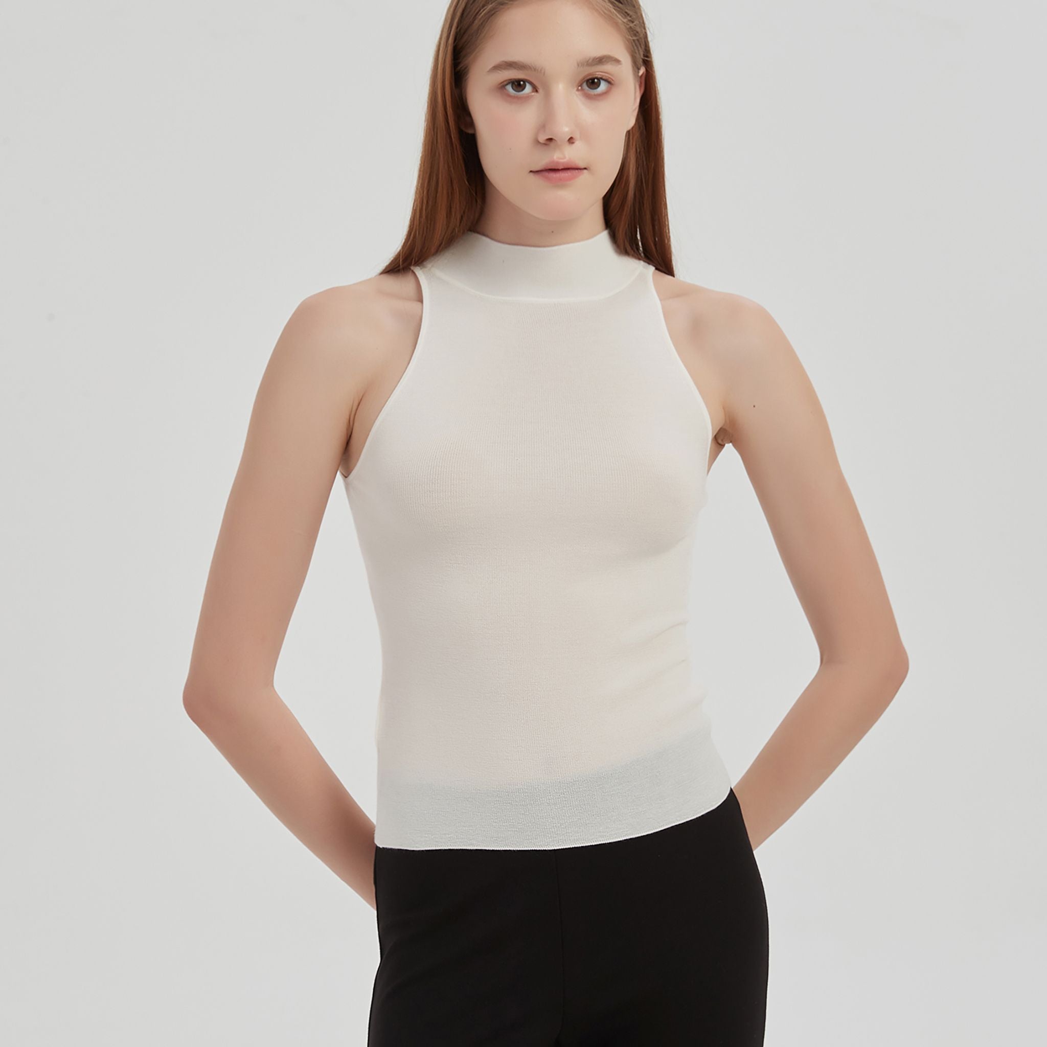 Crafted from an exceptionally fine blend of 16-gauge merino wool and mulberry silk yarns, the May Halterneck Wool and Silk Tank features a halter neckline and stretchy, fine ribbing throughout for a fitted shape. A lightweight, breathable piece perfect for layering. Designed for year-round wear.