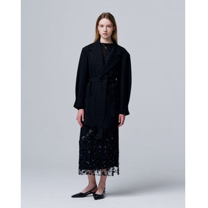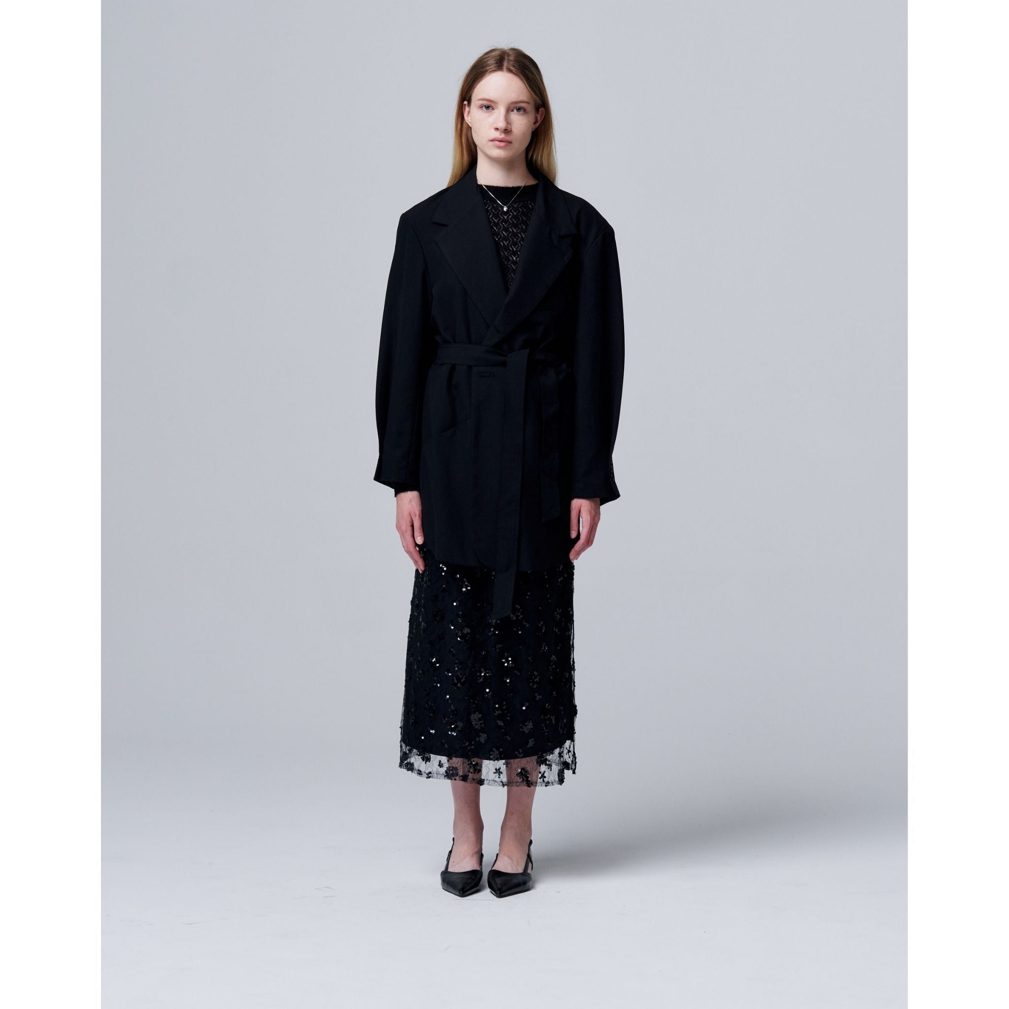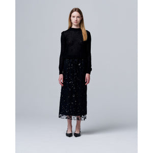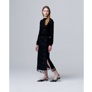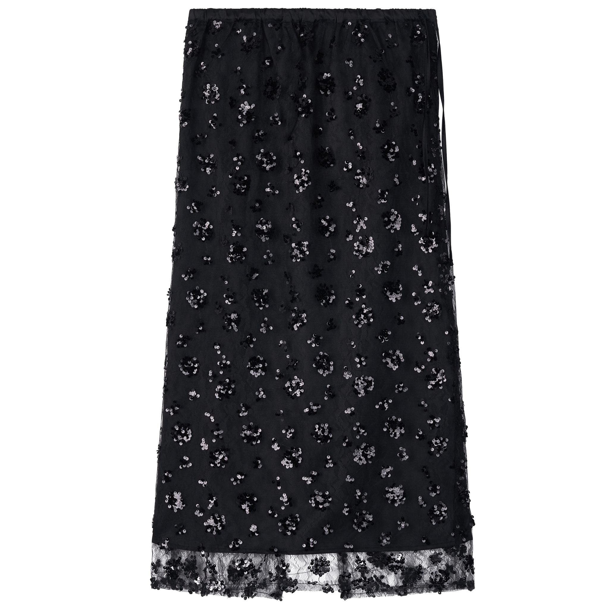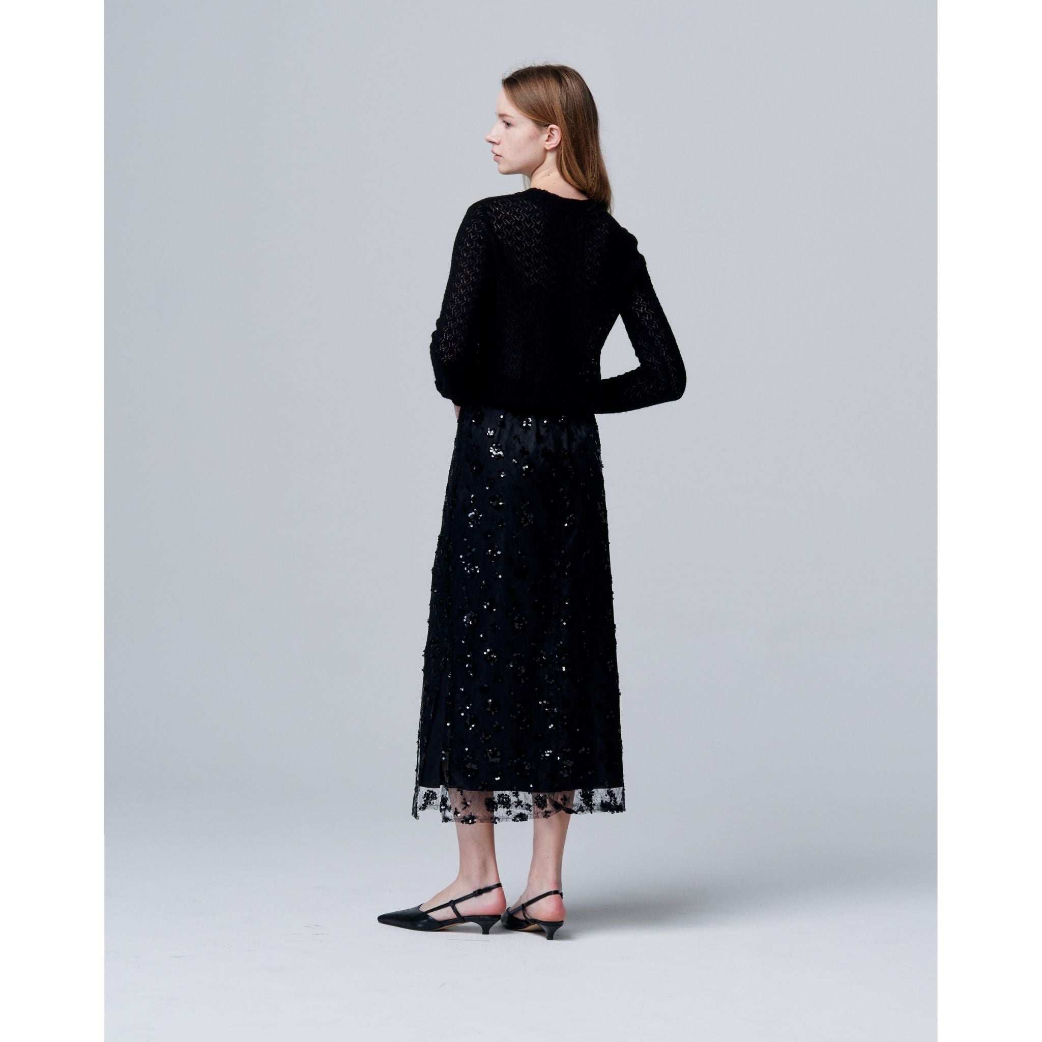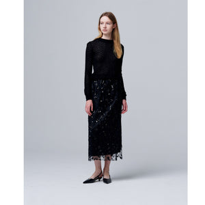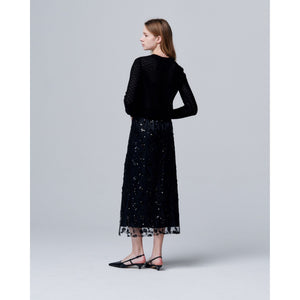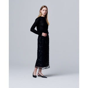 SELL WITH USThe Sequin Beaded Skirt by Oddpresent brings a touch of luxury to any wardrobe. Adorned with delicate sequin beaded floral designs, this skirt combines intricate craftsmanship with modern elegance. The back slit provides ease of movement, while the adjustable waist strap ensures a customizable fit for all body types. Available in black and silver, this skirt is perfect for evening events, weddings, or any special occasion that calls for a statement piece. Style it with a sleek top for a chic and polished look.