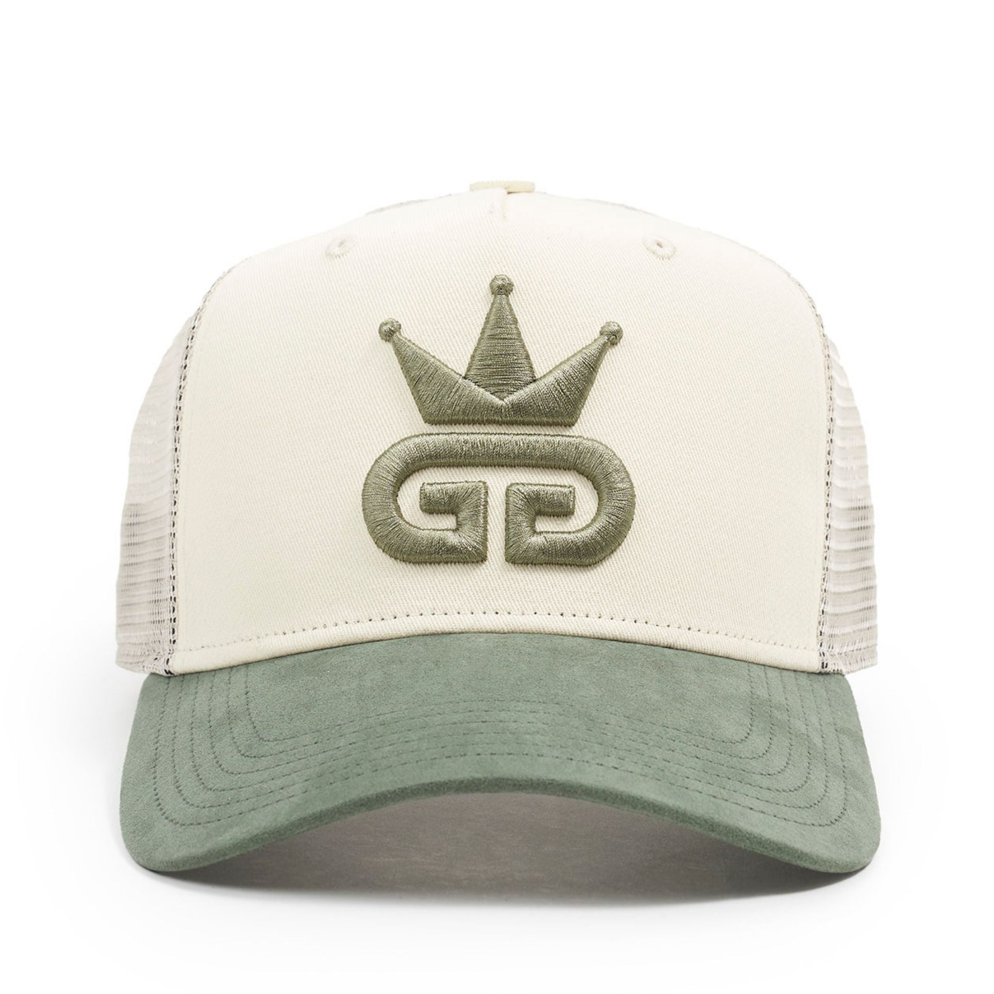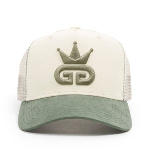 Crafted for standout style and comfort, this retro-inspired snapback features a 100% off-white cotton mesh crown paired with a rich olive green suede peak. Durable polyester side and rear panels add structure, while the embroidered God Given Talent logo in matching olive green brings a bold finishing touch. Adjustable snapback closure for a custom fit.
