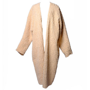 Designed with a relaxed, oversized silhouette, it features dropped shoulders, extended cuffs, and a fluid open-front construction that falls into a softly elongated hem. The piece is unlined to preserve the airy drape of the textile, allowing it to shift effortlessly between lounge and streetwear.