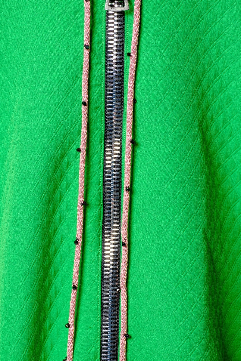 Details matter: a dramatic collar opening, side-set oversized metal zipper, and exaggerated sleeves add architectural depth, while pale pink drawstrings—delicately embroidered with black crystals—introduce a hint of unexpected glamour. Lightweight and unlined, it’s perfect for transitional wear, whether you’re strolling city streets or styling for a weekend away.