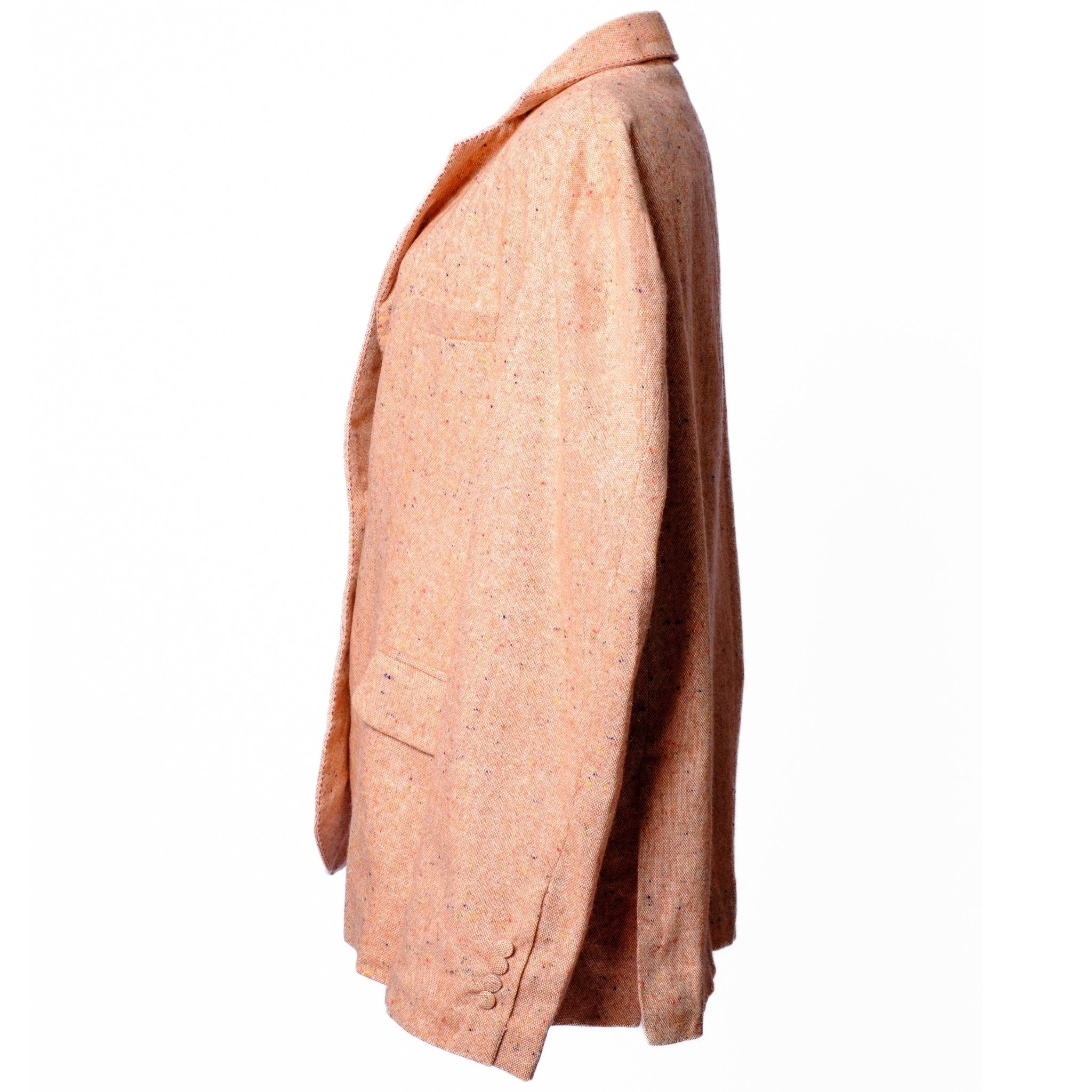 A striped red-and-white cotton lining adds an unexpected layer of refinement, while flap pockets, covered buttons, and a notched collar nod to timeless tailoring codes. The relaxed yet polished cut makes it a versatile piece—equally at home layered over denim for day or styled with tailored trousers for evening.