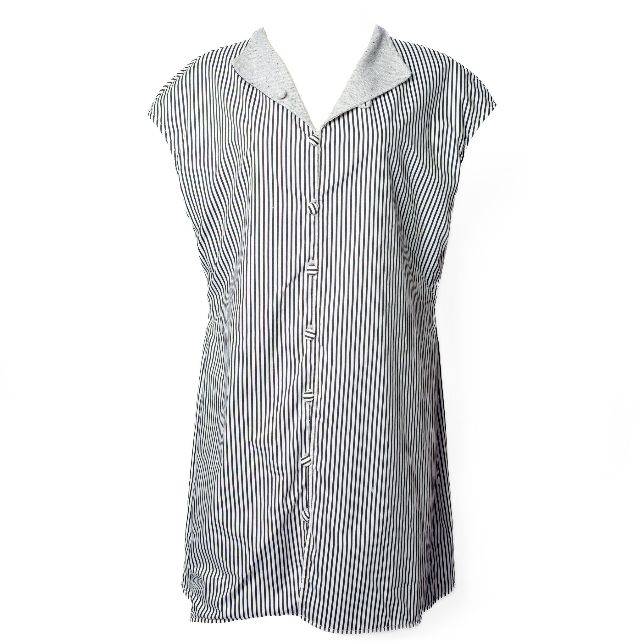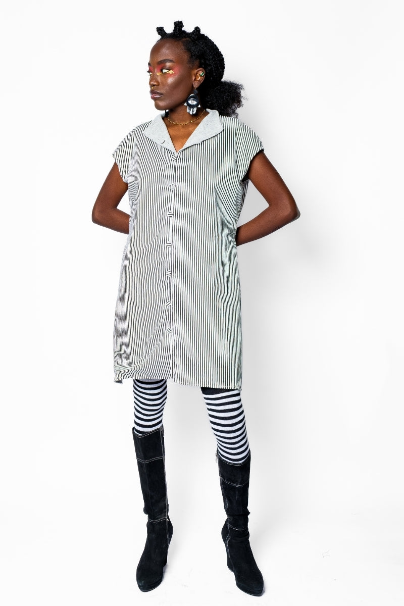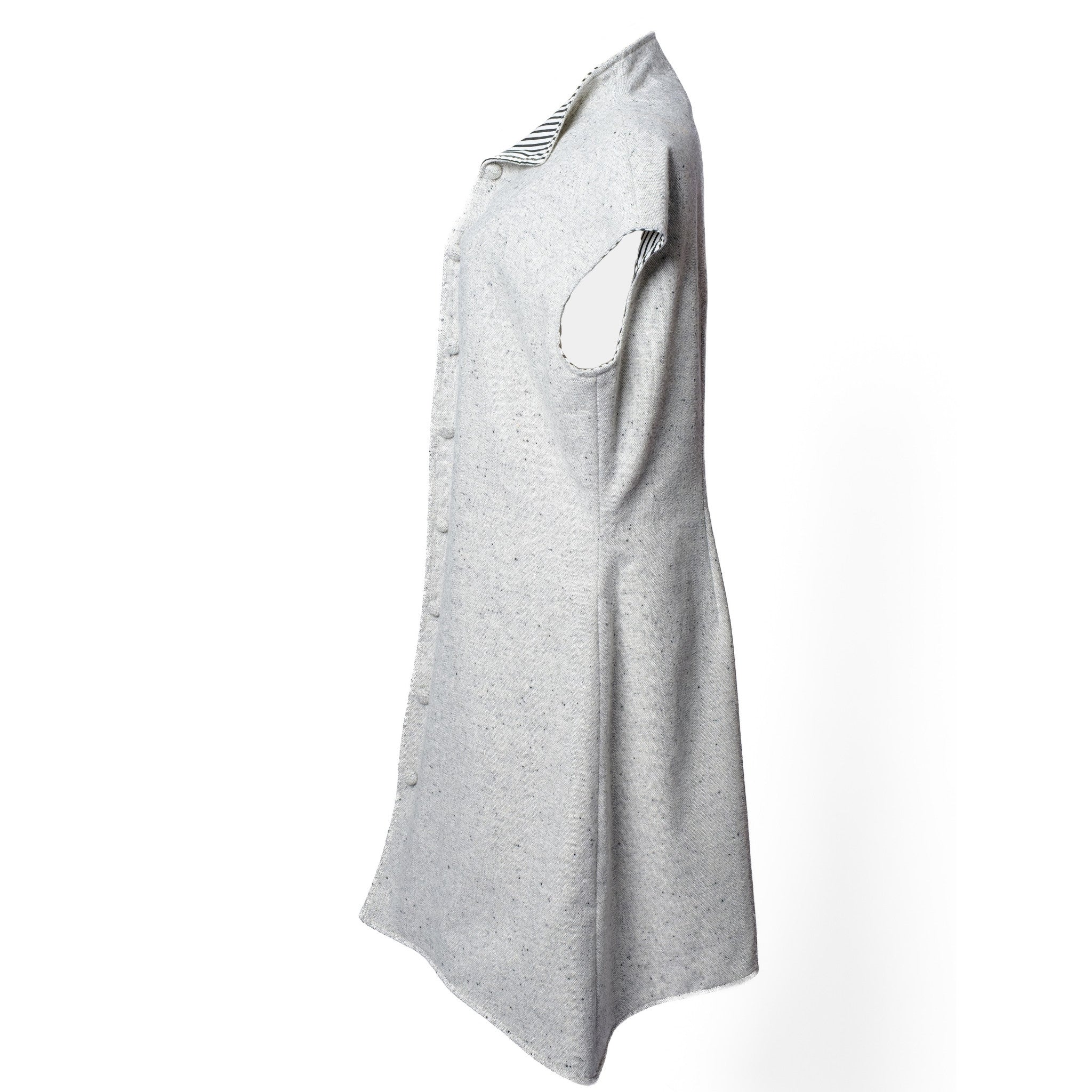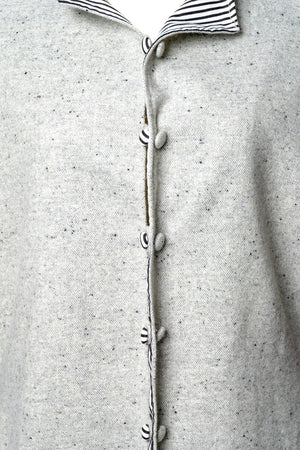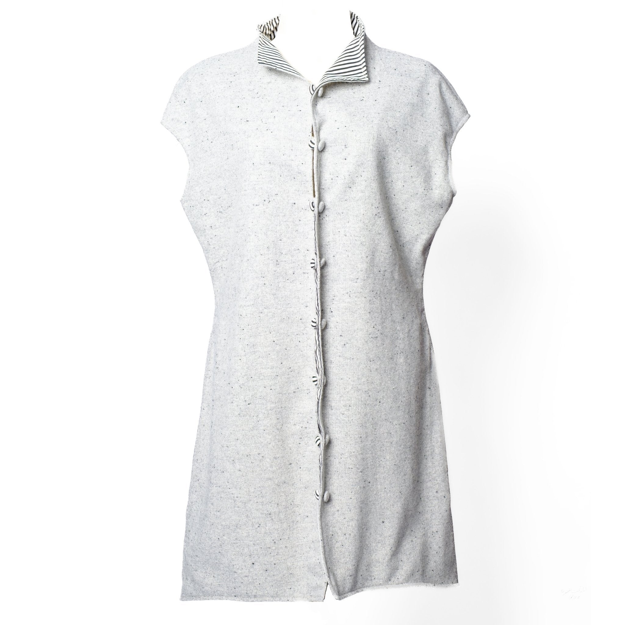 Minimalism meets versatility in this reversible mid-length vest by Otkutyr, a quietly luxurious staple designed for effortless, all-season layering. One side features soft speckled grey wool with a tactile, cozy finish; the other reveals crisp black-and-white striped cotton for a more structured, graphic look. This dual-sided design allows for seamless styling shifts—whether you're curating a monochrome outfit or playing with contrast textures.