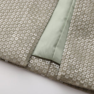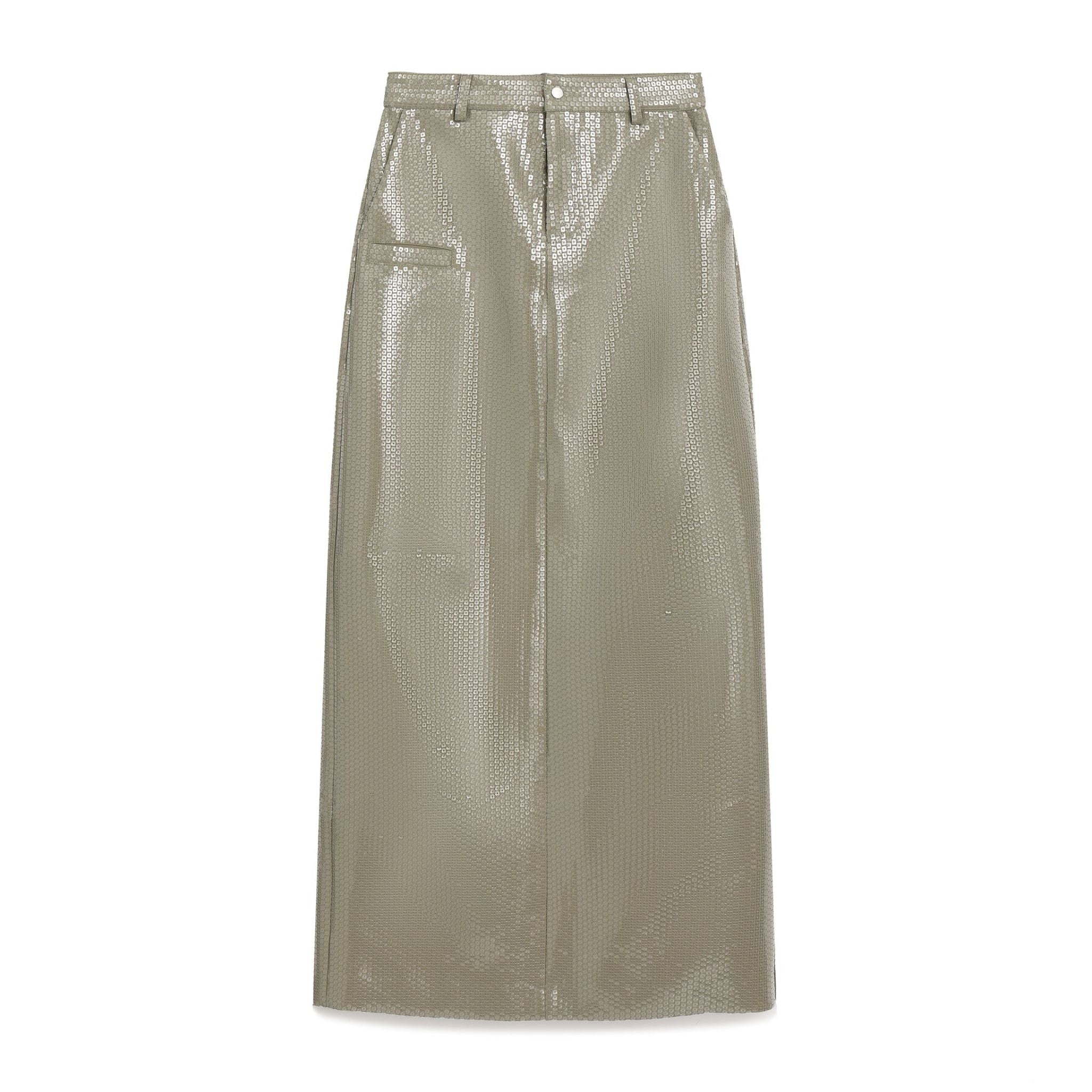 Clear sequin all over embroidery on suiting fabric. Straight maxi skirt silhouette with back center slit.