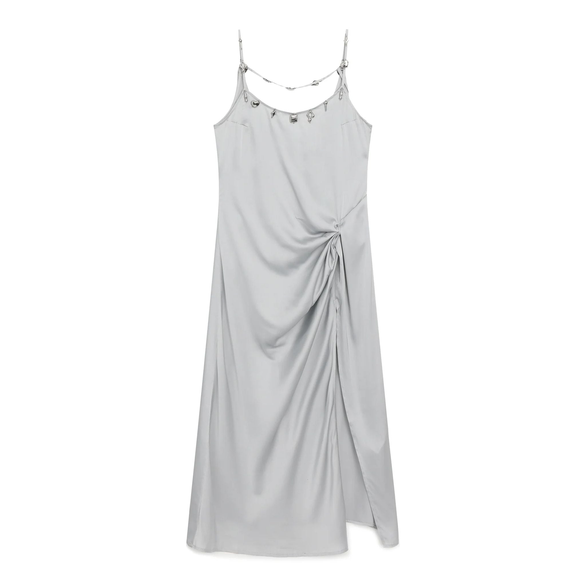 Slip Dress with Silver Charms in K-Wave theme sewn on to neckline and drawstrings. Back center invisible zipper. Fitted at top and flared at bottom, with side slit, and twist.