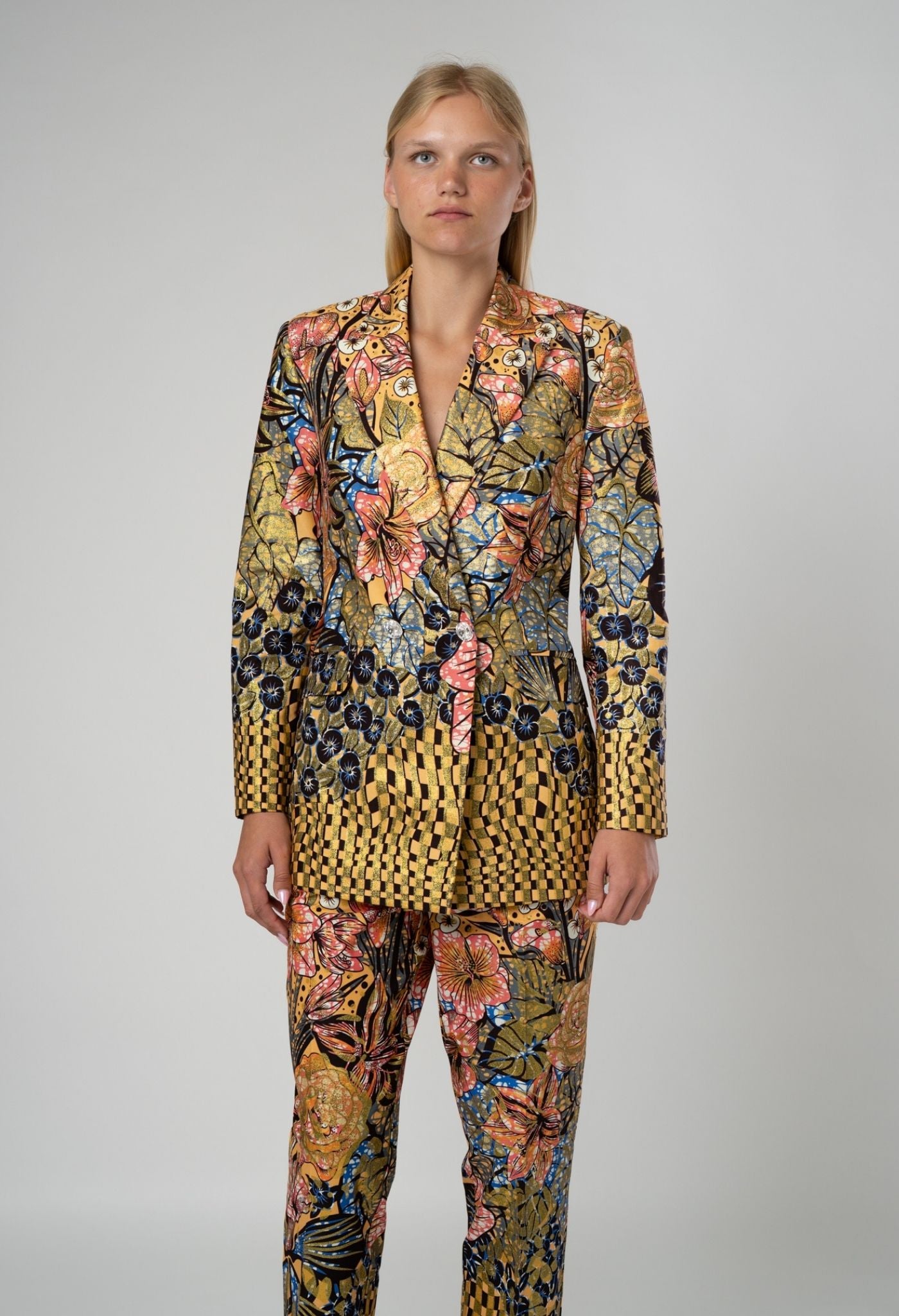 The Flourish Blazer is a belted blazer featuring Swarovski buttons on the front and cuffs. With a spring-inspired floral pattern, this piece represents the brand's growth over the last 10 years, reflecting femininity and the beauty of nature. Perfect for formal occasions or for adding a touch of elegance to a casual look.