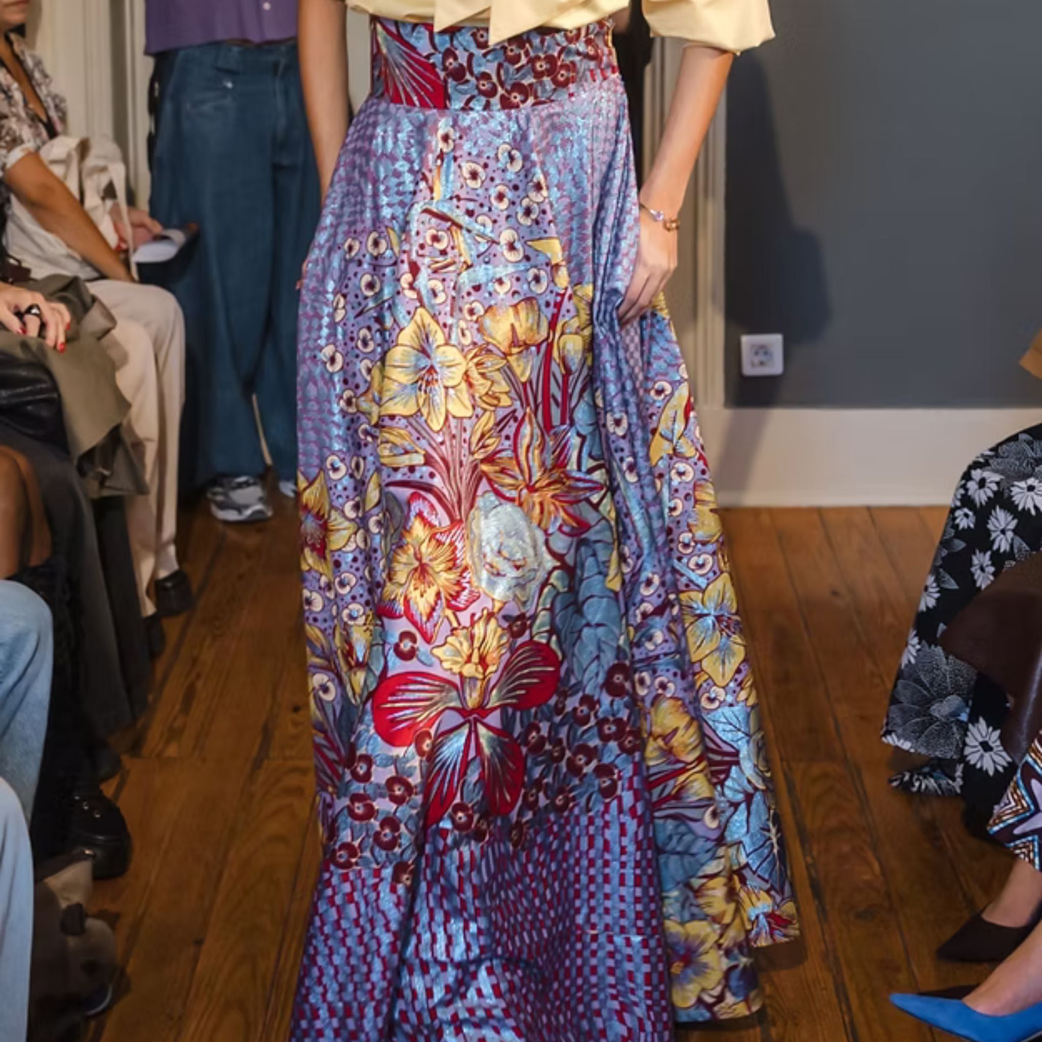 Flourish Purple Maxi Skirt, a must-have in any woman's closet. This maxi skirt features a fluid, flared design, perfect for twirling and swaying with every step. The vibrant patterned print is inspired by beautiful flowers, adding a touch of natural beauty to your outfit. Made from high-quality materials, this skirt is comfortable and perfect for special occasions. Pair it with a simple top and sandals for a relaxed, bohemian look, or wear it with a blouse and heels for a chic, elegant ensemble. Add this Flourish Shell Maxi Skirt to your collection and elevate your style with a touch of feminine grace.