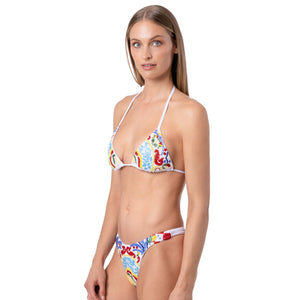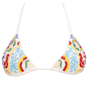 The Limoncello Hand-Beaded Embellished Bikini Top channels the charm of sun-drenched European escapes. Hand-beaded with motifs inspired by vintage countryside patterns and golden lemon groves, it brings a refreshing twist to refined swimwear. Elevated yet playful, this piece is perfect for seaside lunches, resort lounging, or golden-hour dips.
