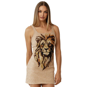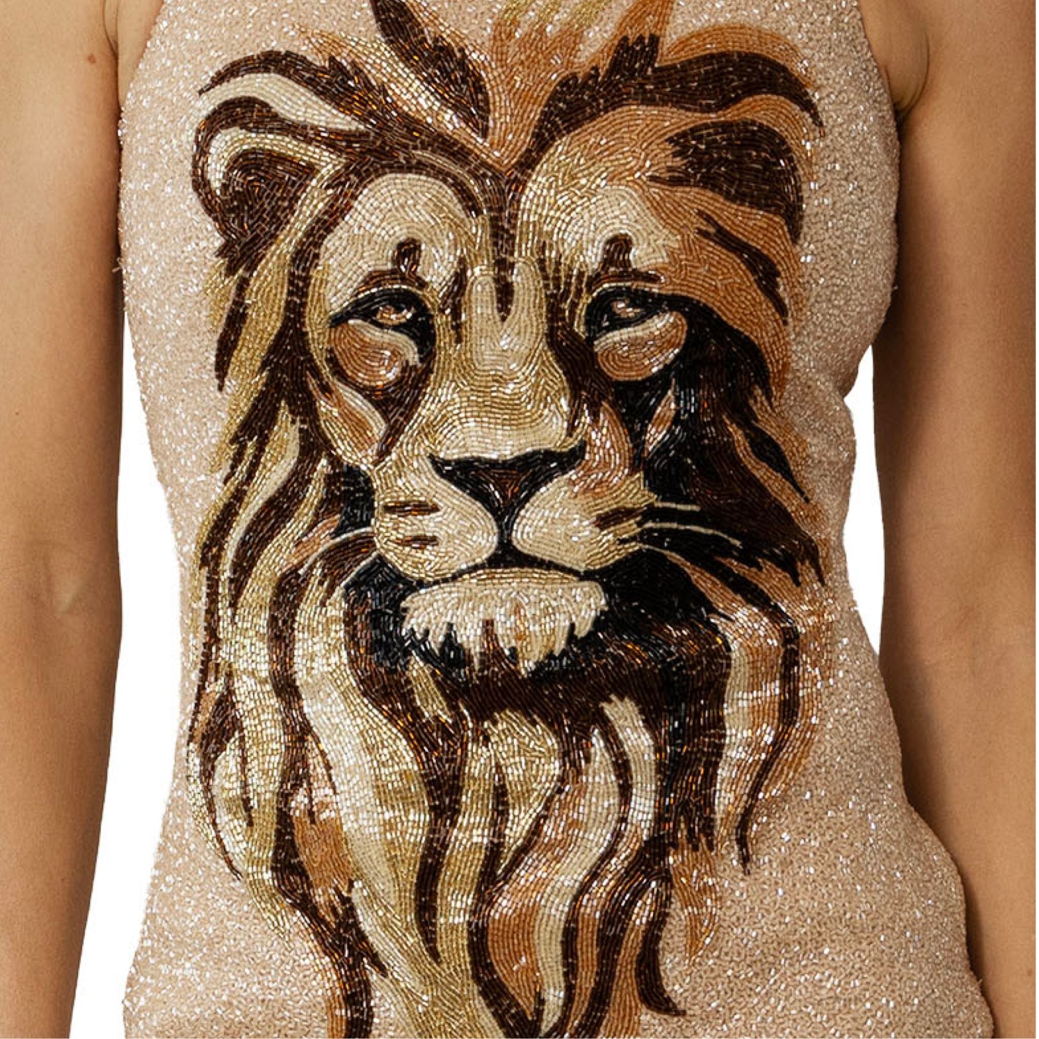 Elegant, powerful, and effortlessly elevated — Majesty is the refined sister to our iconic Lion Dress. Featuring a smaller, hand-beaded lion motif, this mini blends bold artistry with a softer, more wearable silhouette. Crafted by our artisans in India, each bead is placed to create depth, dimension and a warm glow against the champagne base. The sleek cut flatters every curve, making it perfect for evenings out, celebrations, and statement moments without going full drama. A luxurious balance of subtle and striking — Majesty is your new go-to for high-impact elegance.