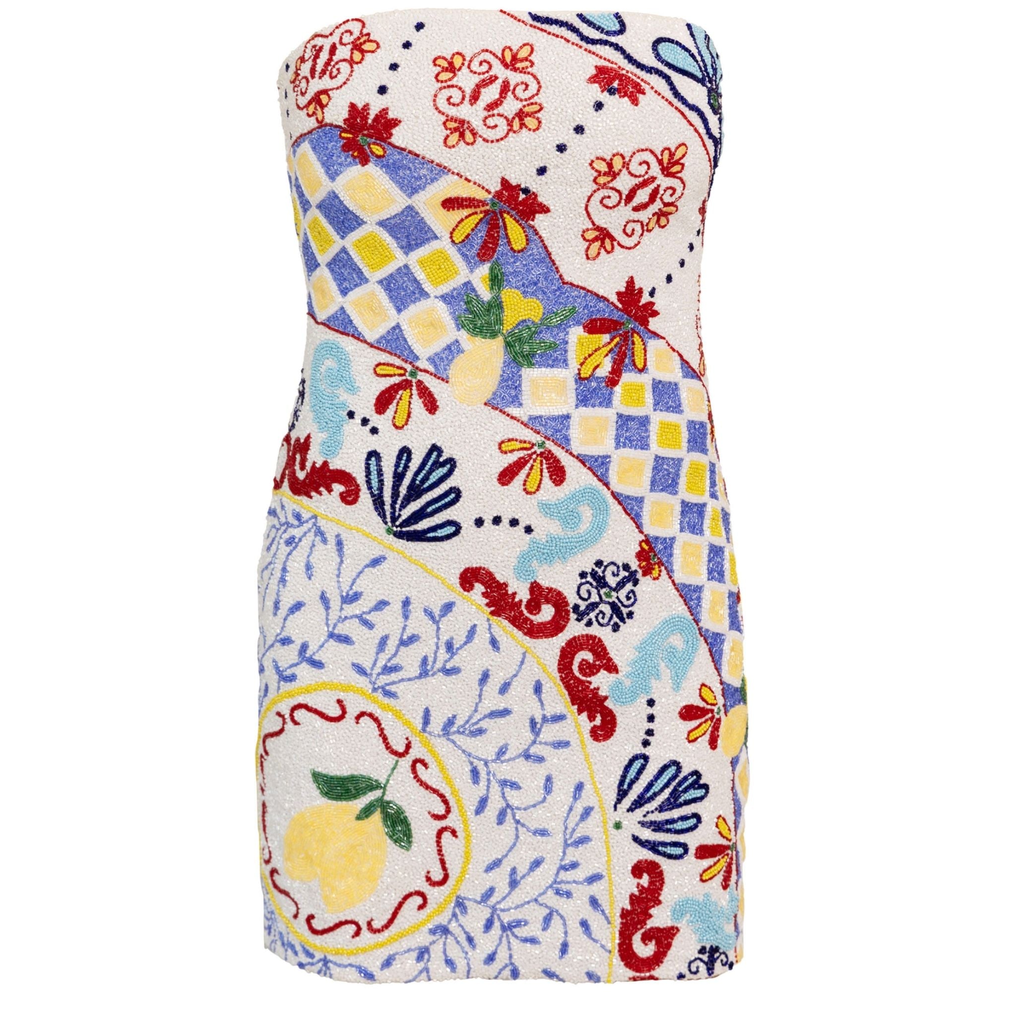 The Senorita Hand-Beaded Embellished Mini Dress is a masterful blend of classic Italian artistry and modern glamour. This strapless mini is fully adorned in intricate beadwork, inspired by timeless Italian patterns. Perfect for both sophisticated daytime outings and glamorous evening events, this piece embodies refined luxury and timeless beauty, making it a versatile wardrobe staple.