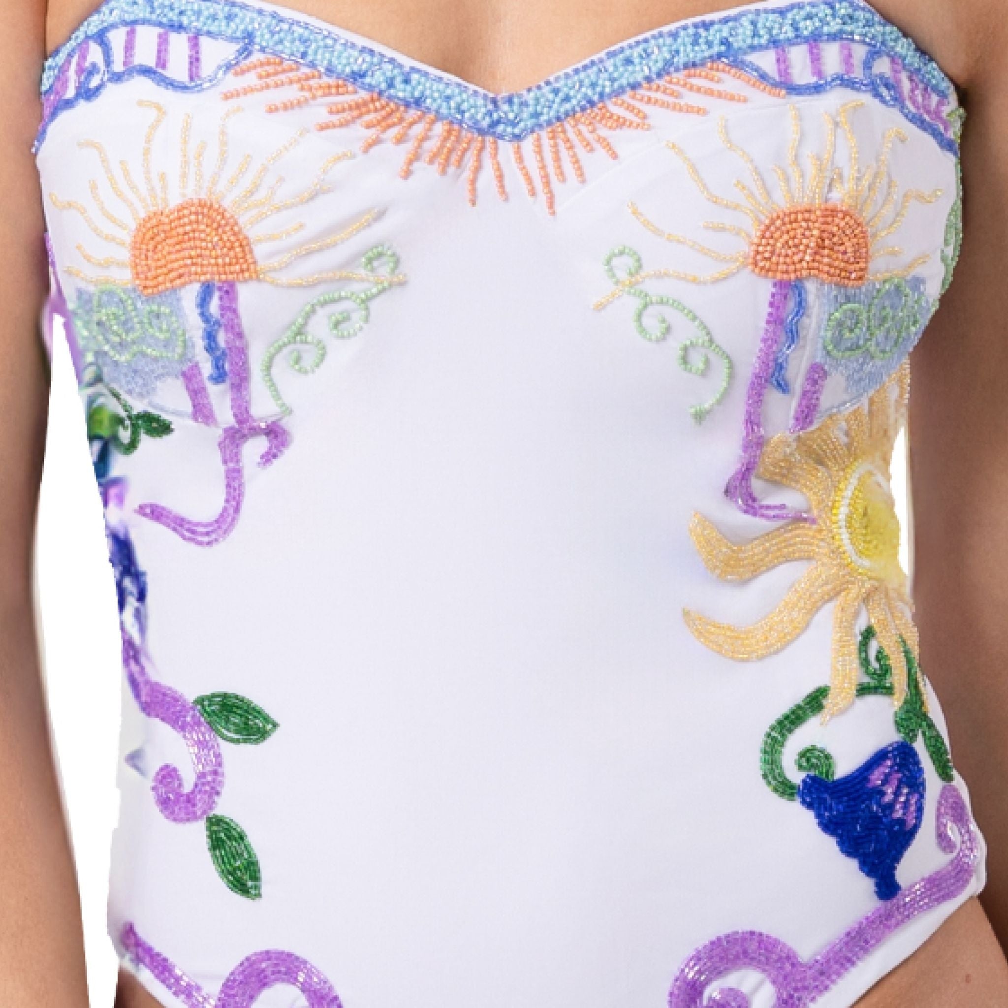 The Serenity Hand-Beaded Embellished One-Piece Swimsuit embodies calm and beauty, with beadwork inspired by the soothing elements. Delicately crafted, the design exudes a serene elegance, bringing a sense of tranquility to your swimwear collection. Perfect for sun-soaked days and serene beach escapes, this swimsuit combines artistic detail with timeless sophistication.