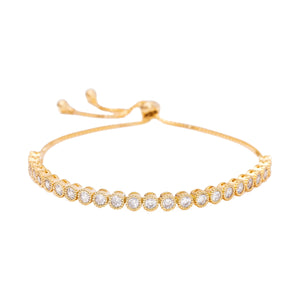 An elevated classic, reimagined for everyday elegance. This gold-tone adjustable tennis bracelet features a continuous strand of bezel-set A7 cubic zirconia for refined sparkle and modern polish. The sliding clasp ensures a perfect fit for any wrist, making it as functional as it is beautiful. Designed to layer or shine solo, it’s the ultimate go-to for casual sophistication or evening glamour. Crafted from a hypoallergenic, nickel-free alloy and finished in rich 18k gold plating. Whether worn with a crisp white shirt or a silk slip dress, this bracelet brings effortless luxe to every moment.