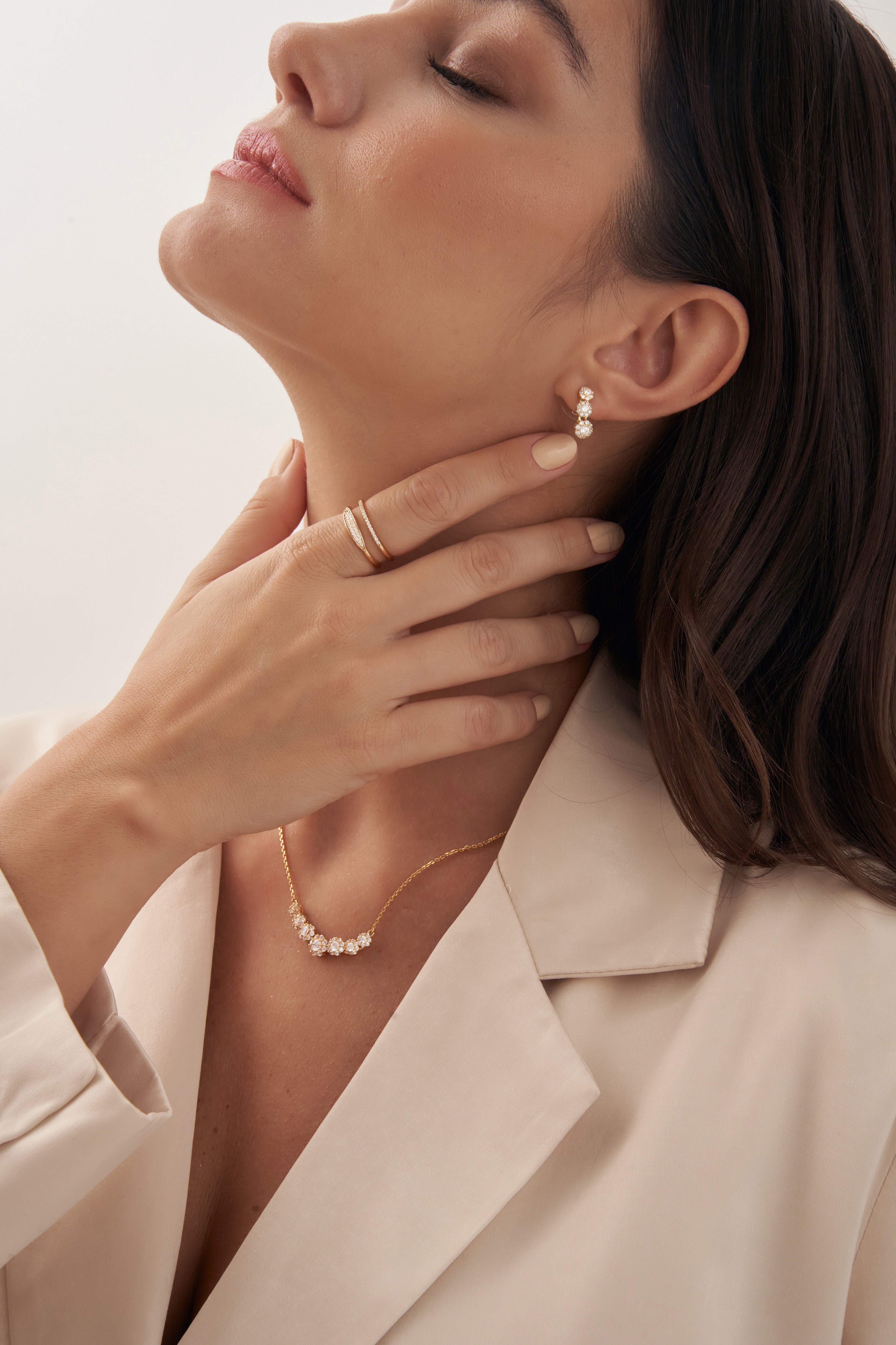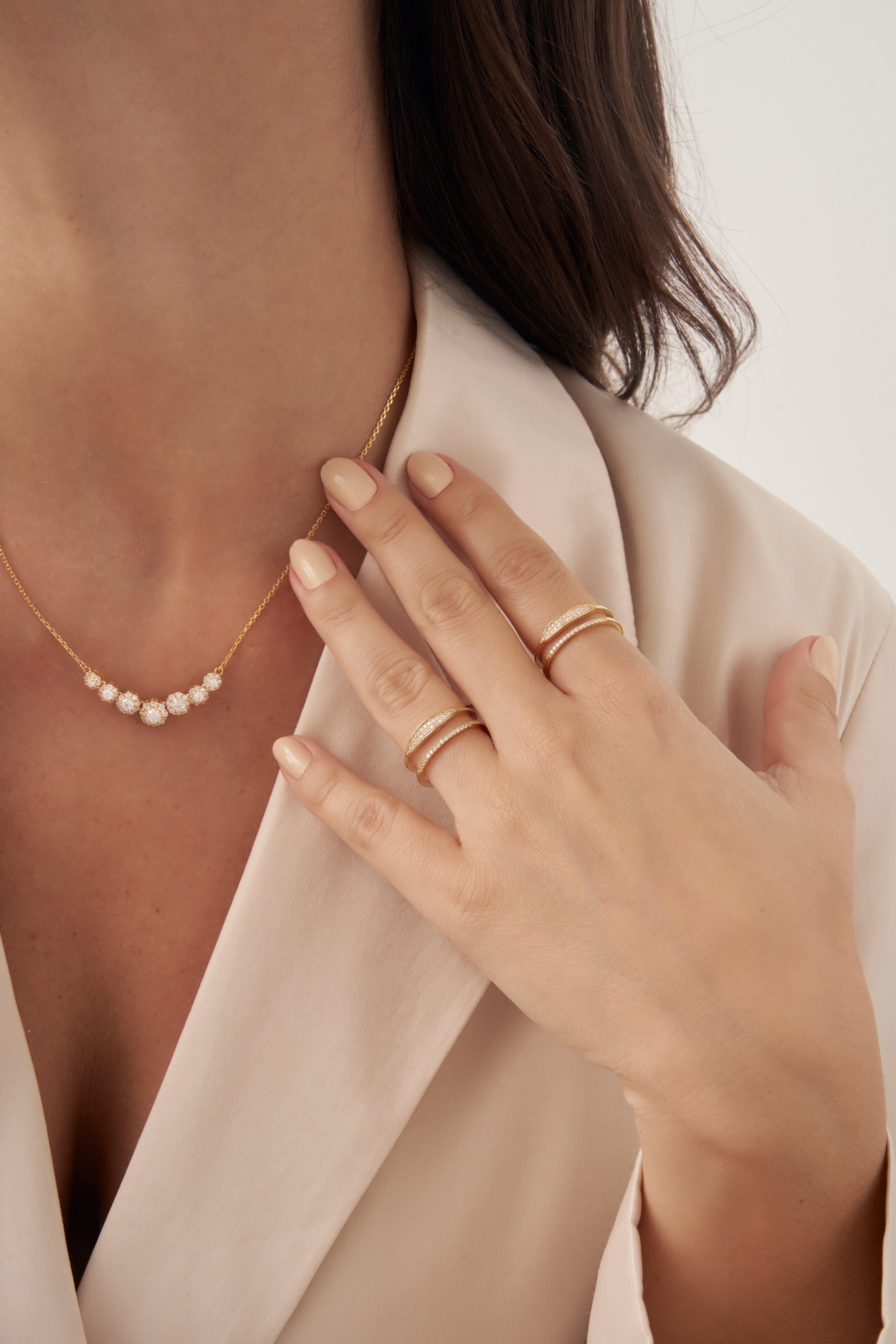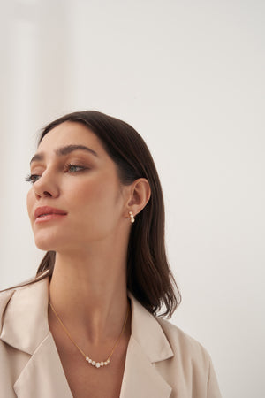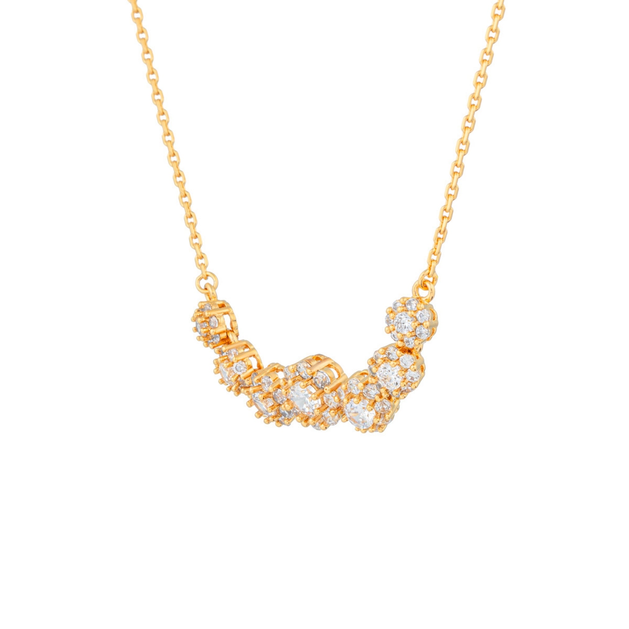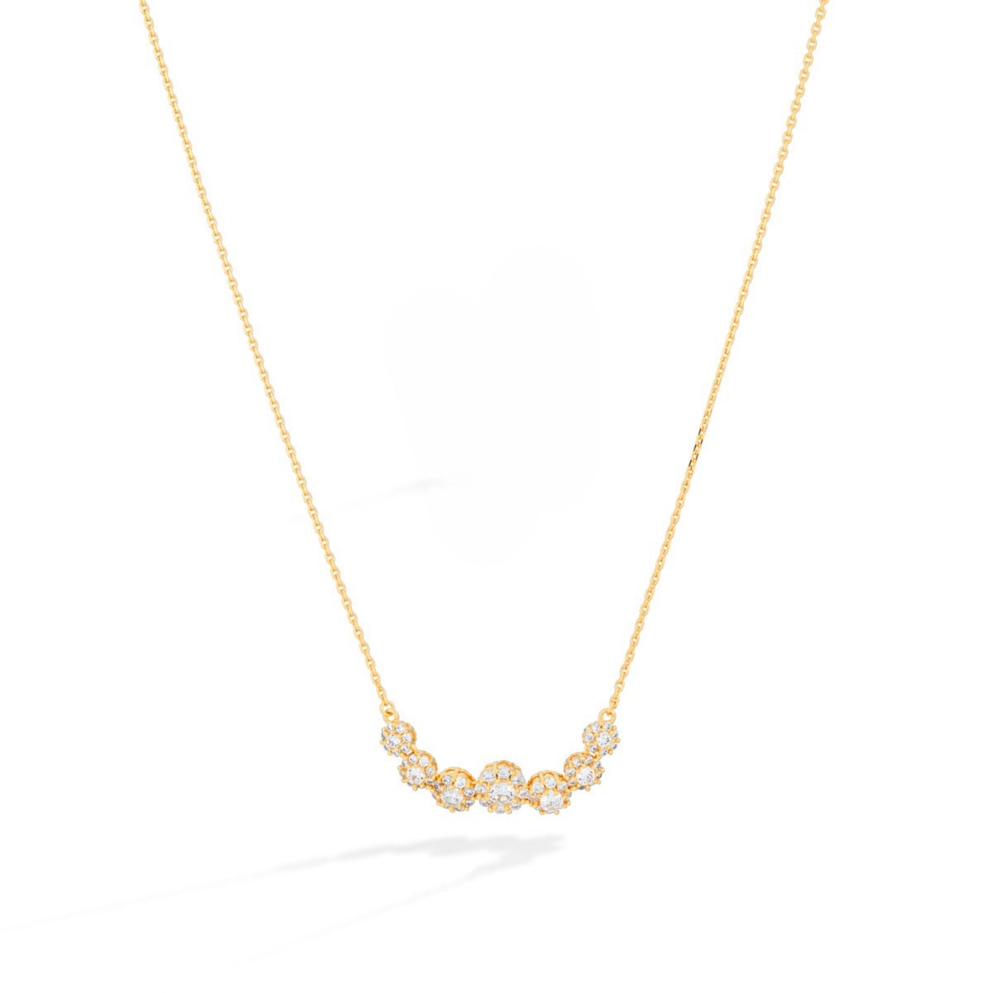 Romantic and radiant, the Eternal Blossoms Necklace by Xhin + Shabella captures the ephemeral beauty of blooming florals—forever frozen in golden light. Crafted with a curved row of intricate flower-like clusters, each set with luminous cubic zirconia, this necklace is designed to draw the eye while remaining lightweight and wearable. The 14k gold-tone chain enhances the feminine sparkle, making it ideal for layering or as a delicate solo statement. Hypoallergenic and nickel-free, it’s as gentle on skin as it is on the planet. Exclusively crafted in small batches for DOORS.NYC, this piece brings poetic elegance to everyday styling.