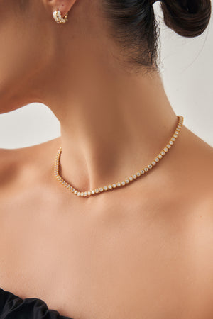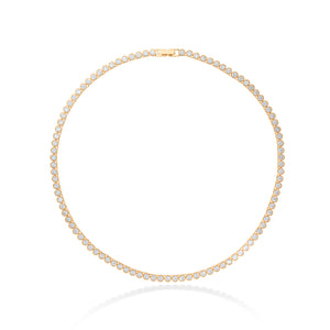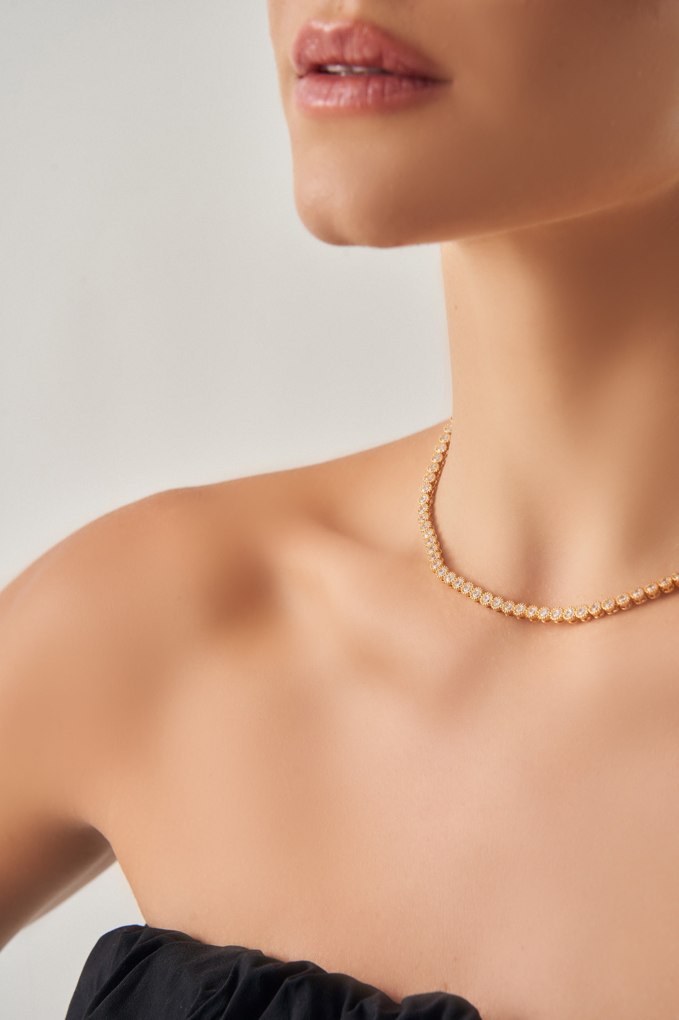 Effortlessly opulent, the Gold Round Tennis Necklace from Xhin + Shabella is a modern heirloom in the making. Set in a warm gold-tone finish, it features a continuous strand of 3mm A7 simulated stones—around 140 sparkling crystals that catch the light with every move. Designed to sit gracefully along the collarbone, this necklace balances impact and ease with its lightweight, durable construction. Wear it as a solo statement or layer with other chains for a fashion-forward look. Ethically crafted in limited quantities, this piece reflects DOORS.NYC’s commitment to independent design and timeless style.