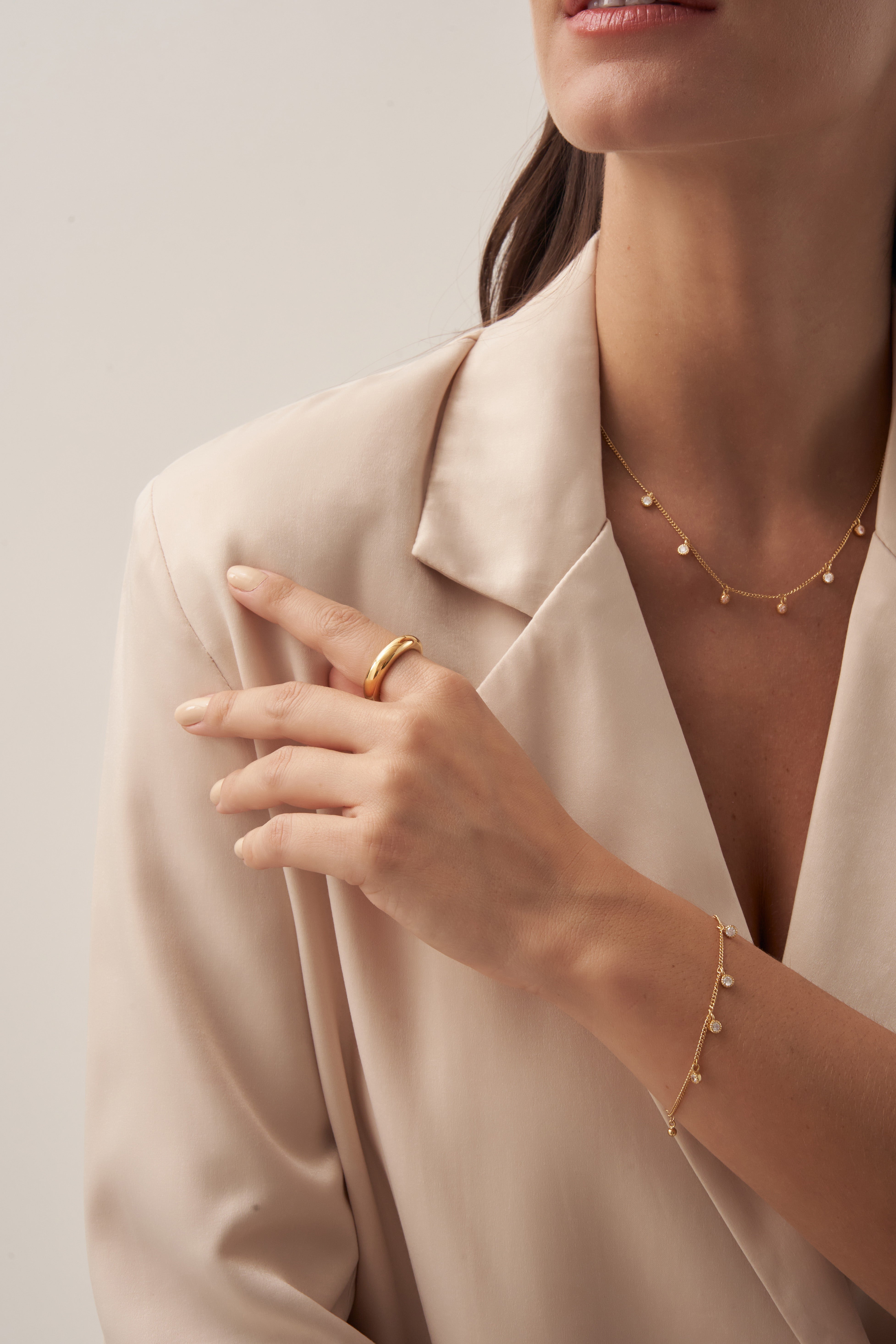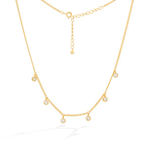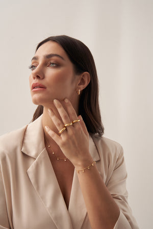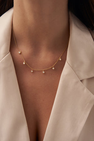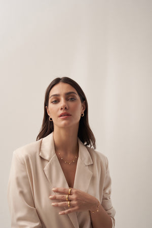 Ethereal yet grounded, the Gold Starry Night Necklace by Xhin + Shabella captures the magic of a golden sky scattered with stars. Crafted from a fine gold-toned chain, it features delicate zirconia drop charms that glisten with movement—echoing constellations at dusk. Lightweight and hypoallergenic, it’s designed for effortless layering and all-day wear. Adjustable for the perfect fit, this necklace brings a hint of celestial elegance to any look, from cotton tees to silk slips. Created in limited quantities, it’s a stargazer’s treasure—available only at DOORS.NYC.