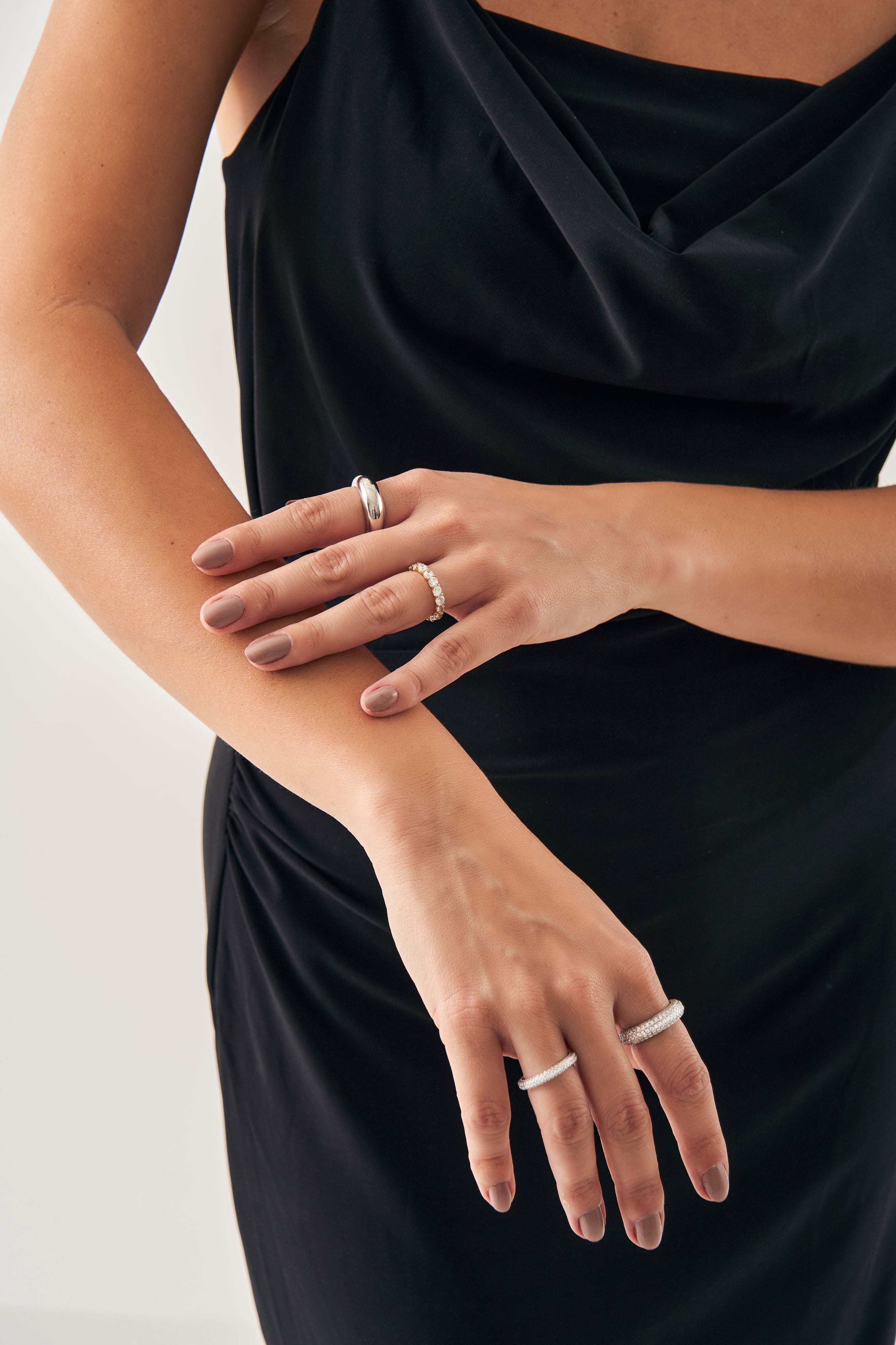 Bold and breathtaking, the Silver Shabella Band by Xhin + Shabella redefines everyday luxury with a full-circle of brilliance. This striking eternity ring is crafted with oversized, round-cut zirconia stones in a polished silver-tone setting—designed to catch the light (and compliments) from every angle. Sleek, modern, and hypoallergenic, it's perfect for those who love a statement without sacrificing comfort. Whether worn alone or paired with slimmer stackers, this signature piece is a radiant staple.