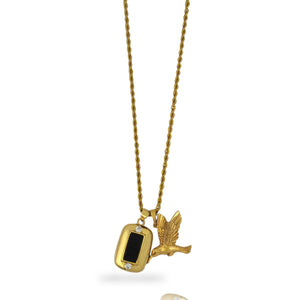 A symbol of resilience and protection, the Heritage Necklace features 18K gold-filled hummingbird and onyx pendants hanging from a 19-inch, 18K gold waterproof and non-tarnish 1mm rope chain.