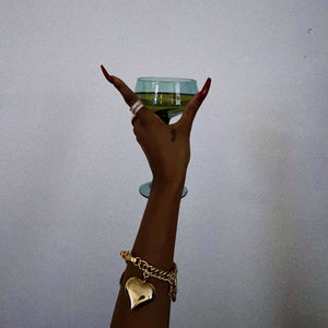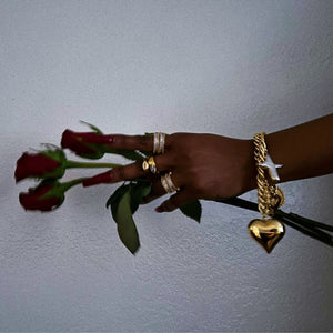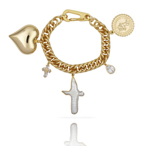 A bold charm stack with vintage attitude, with oversized details that feel playful and nostalgic. Set on a puffy curb chain, the bracelet features super chunky charms, including a freshwater pearl cross, a puffy gold heart, and sparkling teardrop and cross crystal zircon pendants. Finished in 18K gold plating over brass with electroplating for a long-lasting shine.