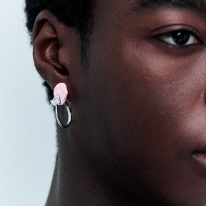 SELL WITH USA satire on sentiment, the Veruca Earring by TAL MASLAVI turns romantic cliché into high-concept art. Designed as a single statement piece, it fuses a classic wedding ring with a chewed gum motif — seemingly glued in place mid-gesture. Crafted from rhodium-coated brass with a glossy enamel finish, the design is completed with a brilliant transparent zirconia stone, adding polish to its provocation.