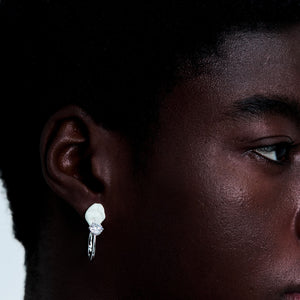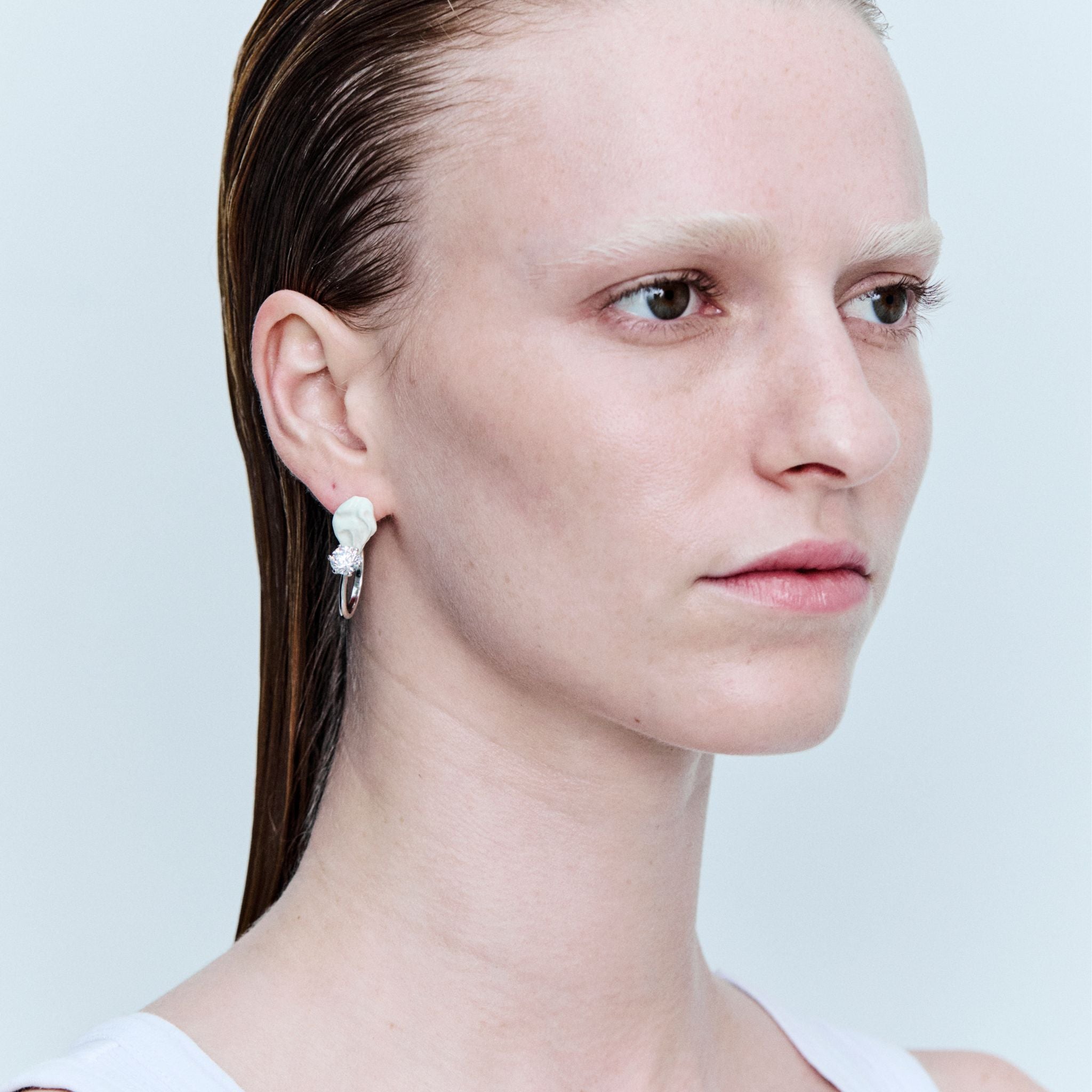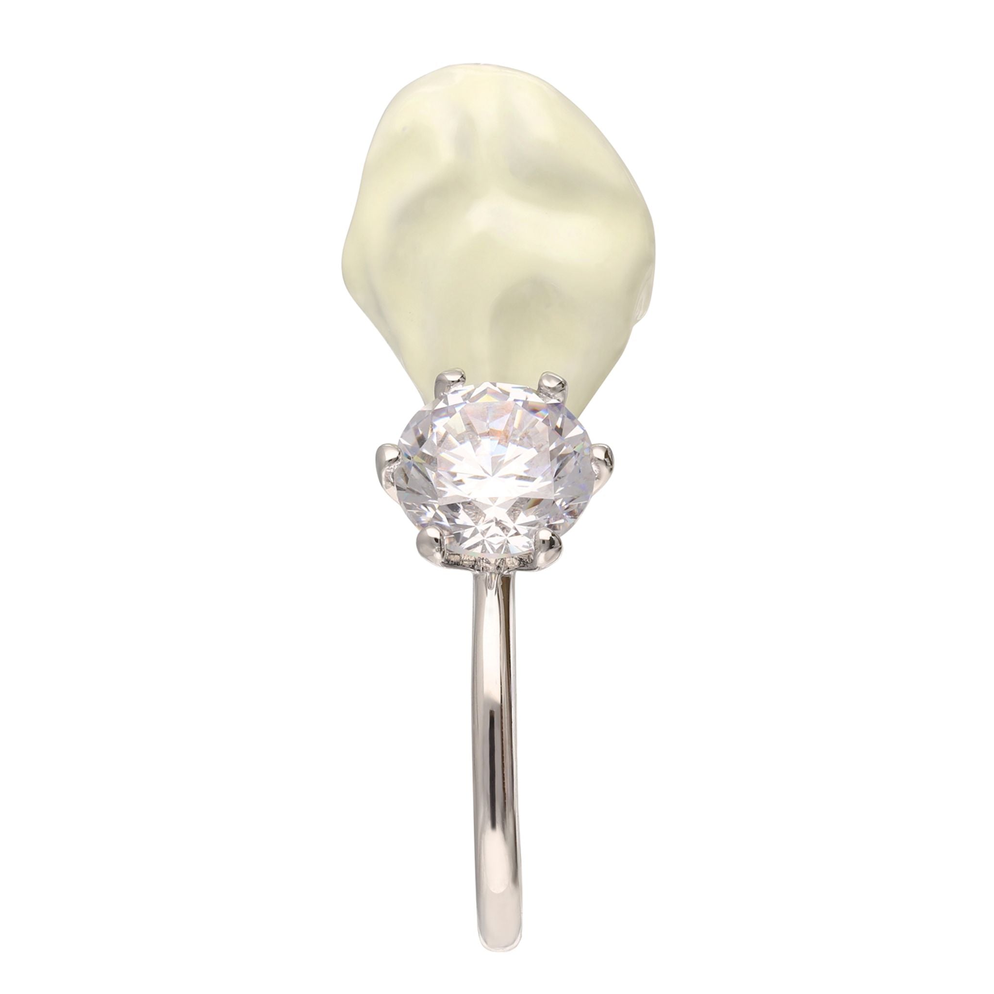 SELL WITH USA satire on sentiment, the Veruca Earring by TAL MASLAVI turns romantic cliché into high-concept art. Designed as a single statement piece, it fuses a classic wedding ring with a chewed gum motif - seemingly glued in place mid-gesture. Crafted from rhodium-coated brass with a glossy enamel finish, the design is completed with a brilliant transparent zirconia stone, adding polish to its provocation.