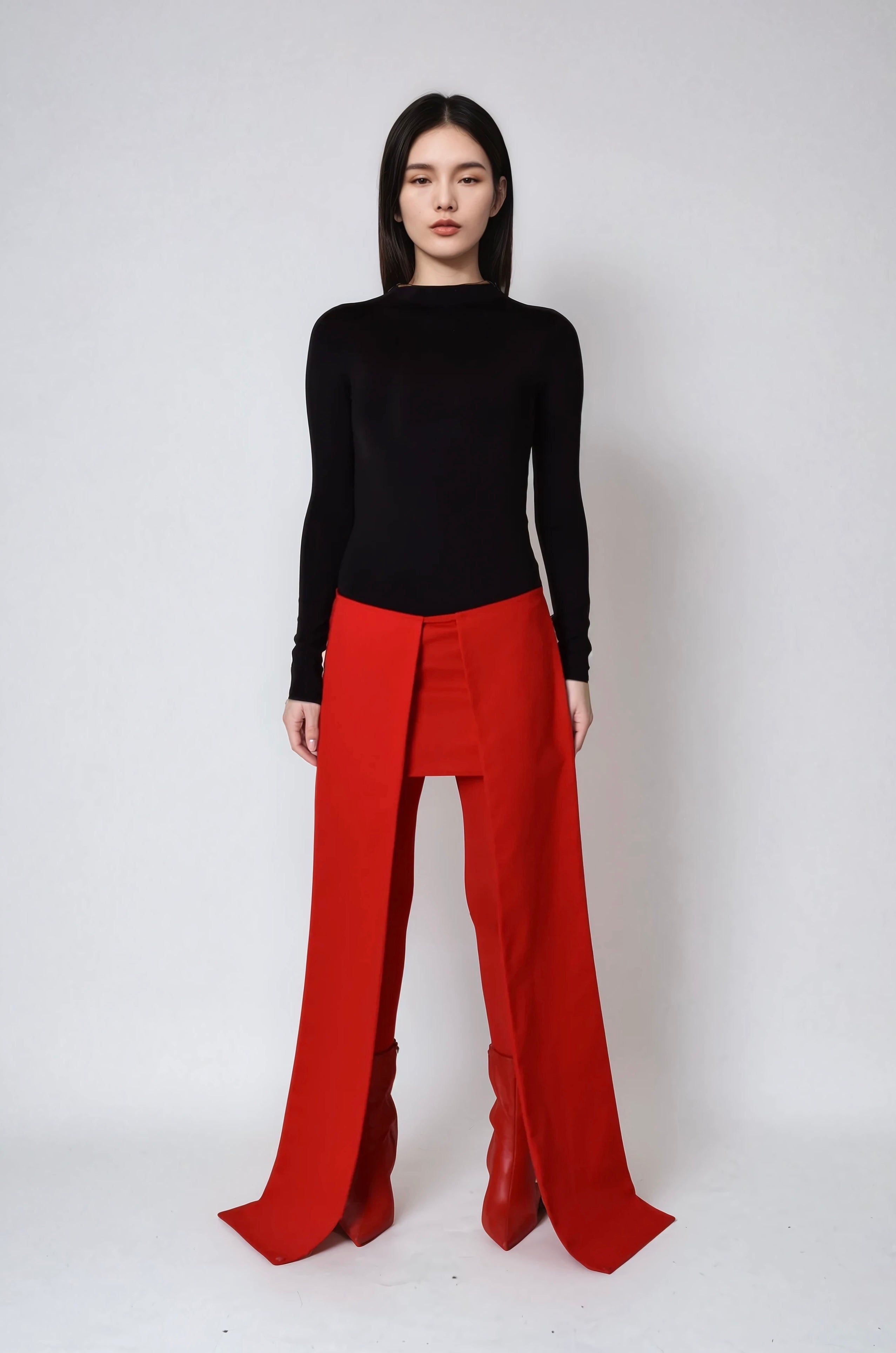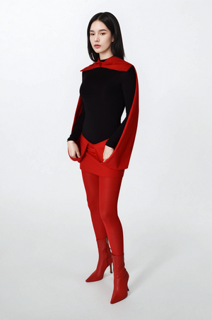 “Musubi” means “union” in Japanese — a symbol of connection, where the red thread of fate ties itself in the right place. This vibrant red mini skirt plays with infinite possibilities. Its front features long, floor-grazing panels that can be wrapped, tied, or fastened in multiple ways — each creating a unique silhouette. With no single path to follow, the design invites the wearer to explore and define their own connection.