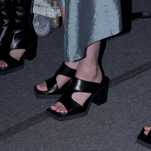 Architectural and modern, these black leather mules by THEN redefine everyday heels with sculptural edge. Crafted in a limited studio run, they feature a glossy leather upper with a carved cutout that frames the foot in a bold, minimal silhouette. A square toe and wide block heel provide stability and comfort, while a padded insole ensures day-to-night wearability. Style with tailored trousers, slip dresses, or structured denim for a sleek, refined finish.