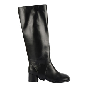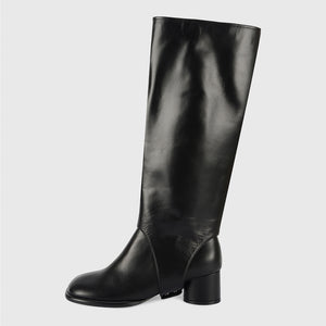 A study in modular minimalism, these black convertible knee-high boots by THEN offer two silhouettes in one sculptural design. Handcrafted in Korea in a limited studio run, each pair transforms effortlessly from sleek knee-high to ankle boot, thanks to a removable leather upper that slips over the base with a seamless finish. Cut from supple black leather, they feature a rounded square toe, architectural lines, and a stable block heel designed for all-day wear. As a knee-high boot, they bring bold polish to winter tailoring; as an ankle boot, they offer understated ease for daily city wear. Thoughtfully made by Korean artisans, this piece reflects THEN’s signature balance of sculptural form and quiet versatility - built to adapt, made to last.