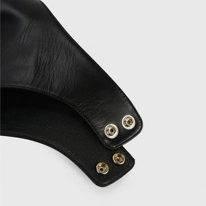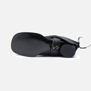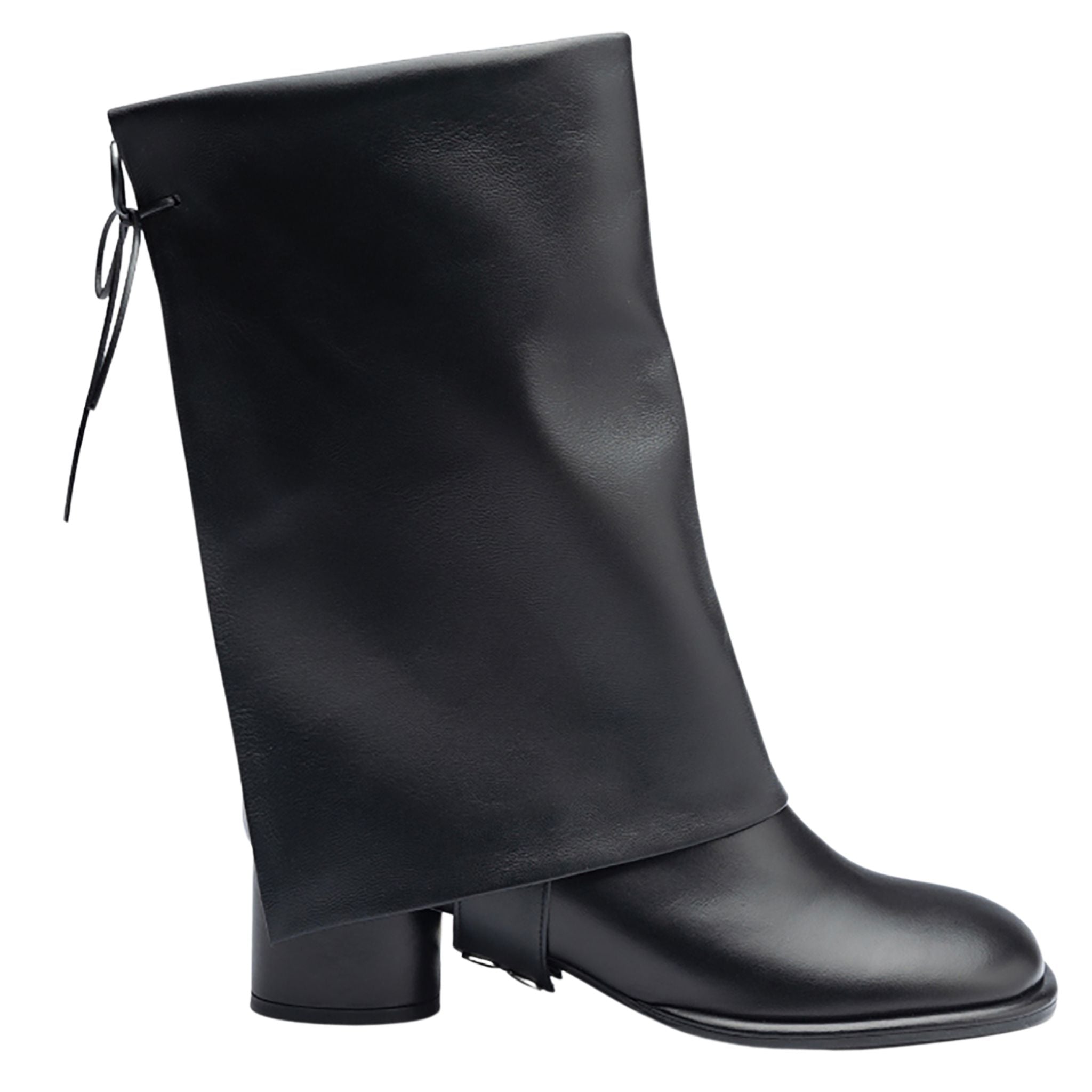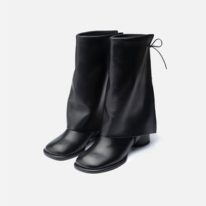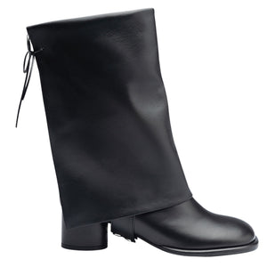 Architectural yet effortless, these black convertible mid-calf boots by THEN fuse sculptural form with everyday wearability. Crafted from smooth premium leather, they feature an oversized removable gaiter that drapes fluidly around the leg, secured with a minimalist back tie. Switch between two silhouettes: bold and layered with the gaiter, or clean and structured as a standalone ankle boot. A rounded square toe and stable block heel offer all-day comfort with elevated polish. Versatile and artfully constructed, these boots reflect THEN’s commitment to quiet luxury and modular design - perfect for transitional dressing with a modern edge.