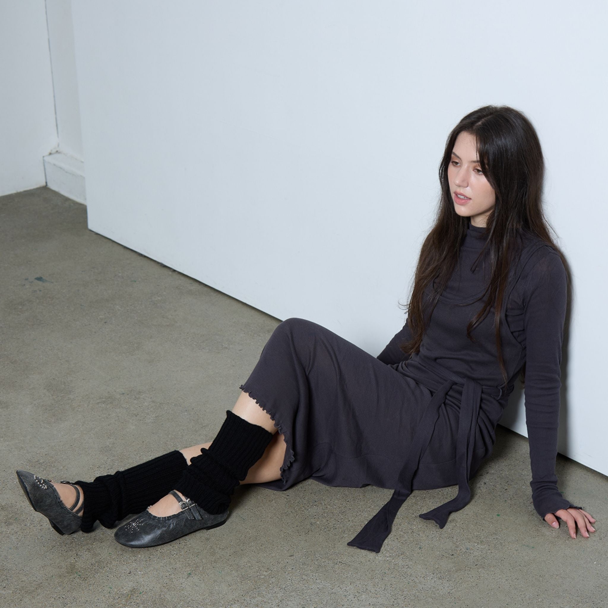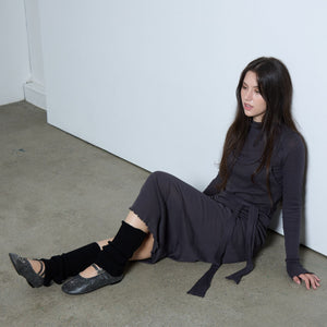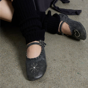Blending vintage romance with modern edge, these black distressed ballerina flats by THEN are handcrafted in Korea in a limited studio run. Featuring a worn-in textured finish, wraparound laces, dual buckled straps, and subtle heart and star studs, they balance femininity with sculptural detail. Perfect for year-round styling, they pair effortlessly with soft tailoring, slip skirts, or denim. A grounded yet expressive essential for collectors of independent design and quiet character.