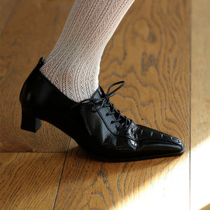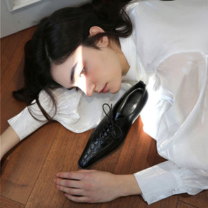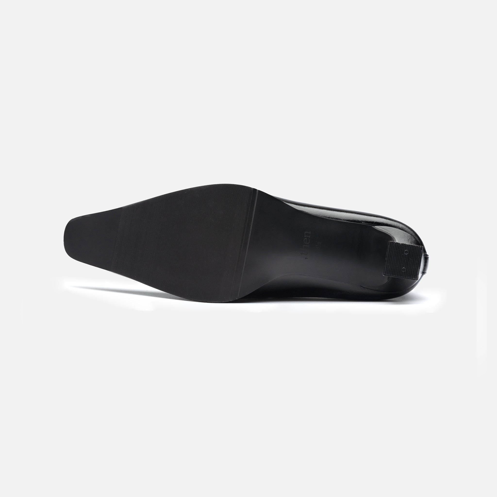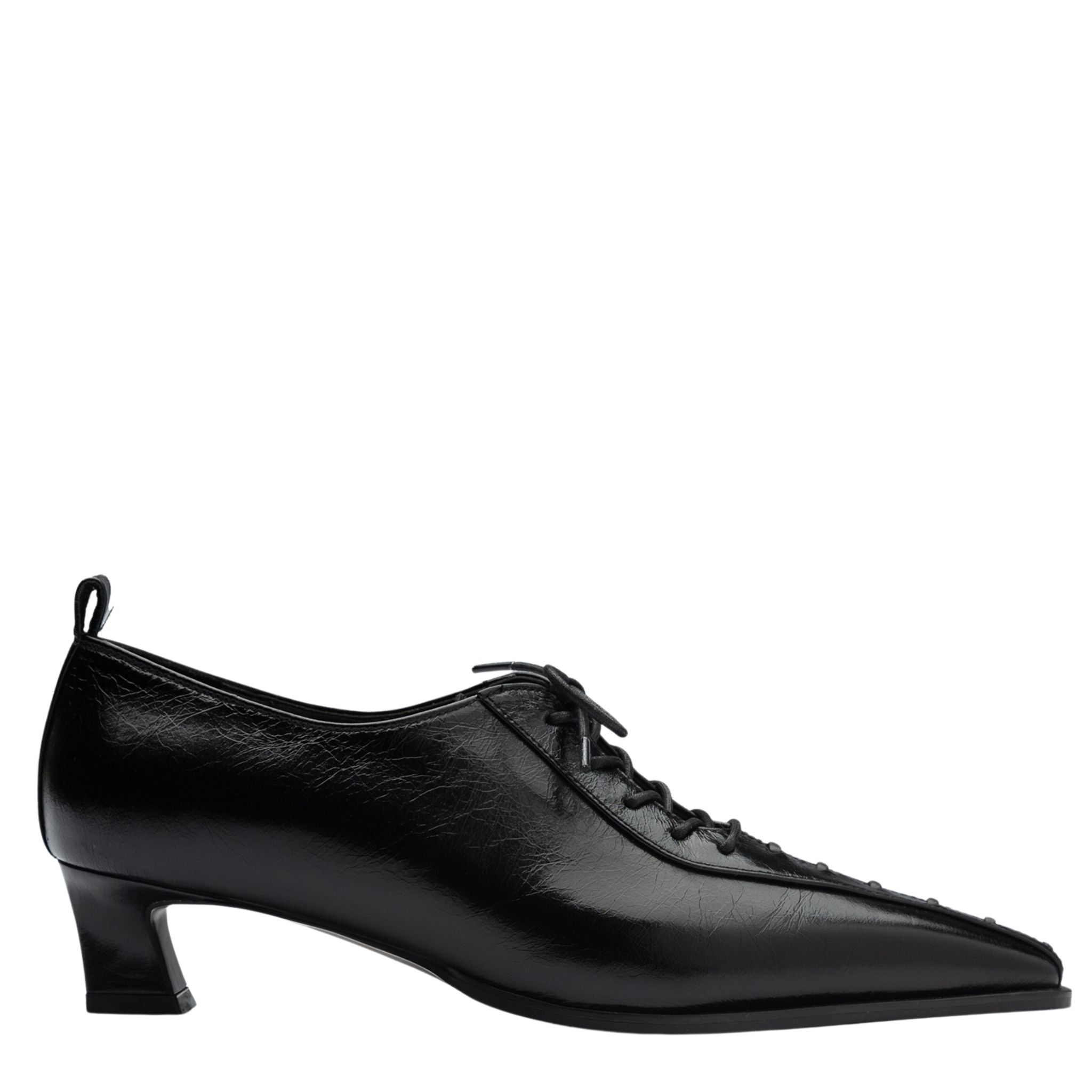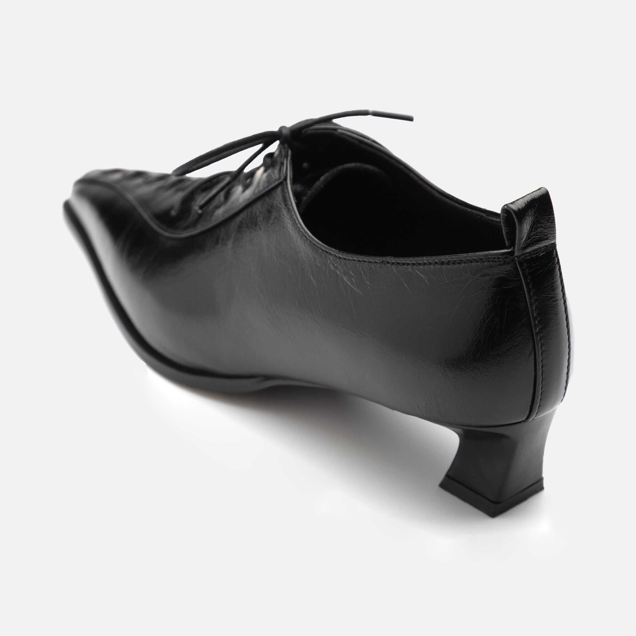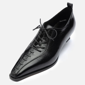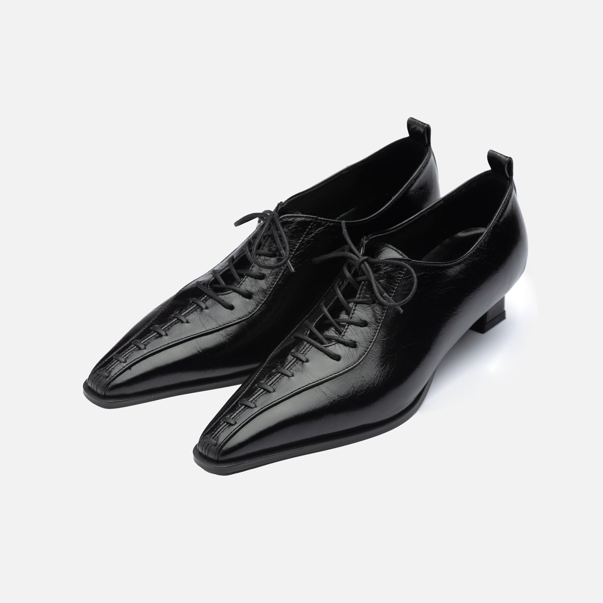 Sleek and sculptural, these black lace-up kitten heels by THEN express modern femininity through precision and restraint. Made in Korea from high-gloss leather, they feature an elongated almond toe and delicate front lacing for a refined, architectural silhouette. With a low, balanced heel designed for comfort and quiet presence, they transition effortlessly from day to night. The soft structure and fine stitching reflect rare craftsmanship and the quiet edge that defines THEN’s minimalist aesthetic.