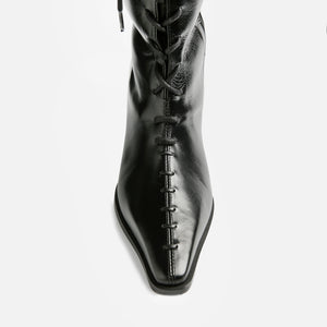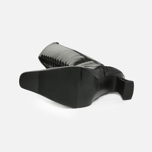 Sculptural and elegant, these black knee-high leather boots by THEN channel modern femininity with precision and quiet power. Made in Korea in a limited studio run, they feature a tapered square toe, sculpted mid-heel, and architectural front lacing. Polished high-gloss leather adds a refined finish, pairing effortlessly with tailored trousers, fluid skirts, or oversized knits. Built for movement and modern city life, this is elevated everyday wear with rare design intent - minimalist, bold, and timeless.