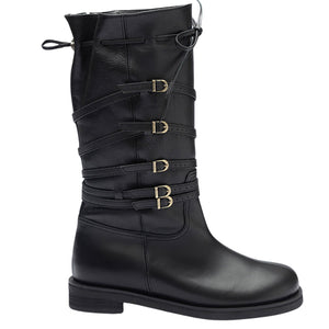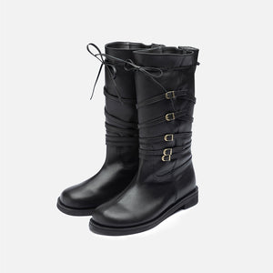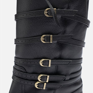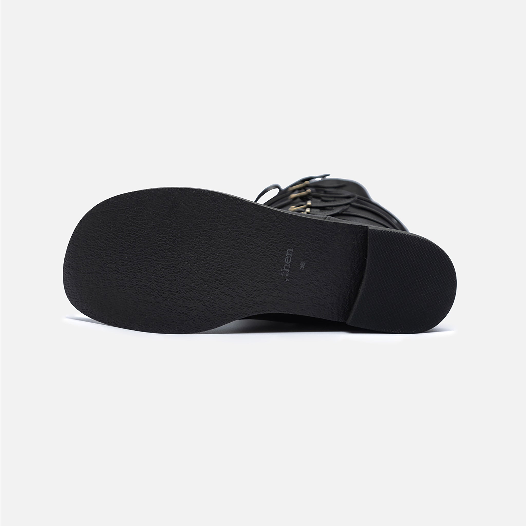 Sculptural and utilitarian, these black leather mid-calf boots by THEN bring modern structure to everyday wear. Handcrafted in Korea in a limited studio run, they feature a rounded toe, subtle grain texture, and a dramatic wraparound lacing system with antique-finish buckles. Designed for comfort and versatility, the low sole supports daylong wear, while adjustable straps offer a tailored fit. Ideal for fall and winter, they style effortlessly with long coats, structured skirts, or slim trousers - delivering quiet power in every step.