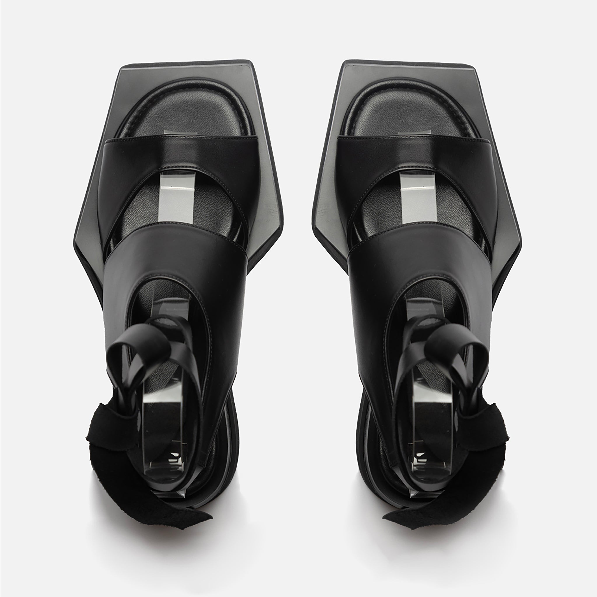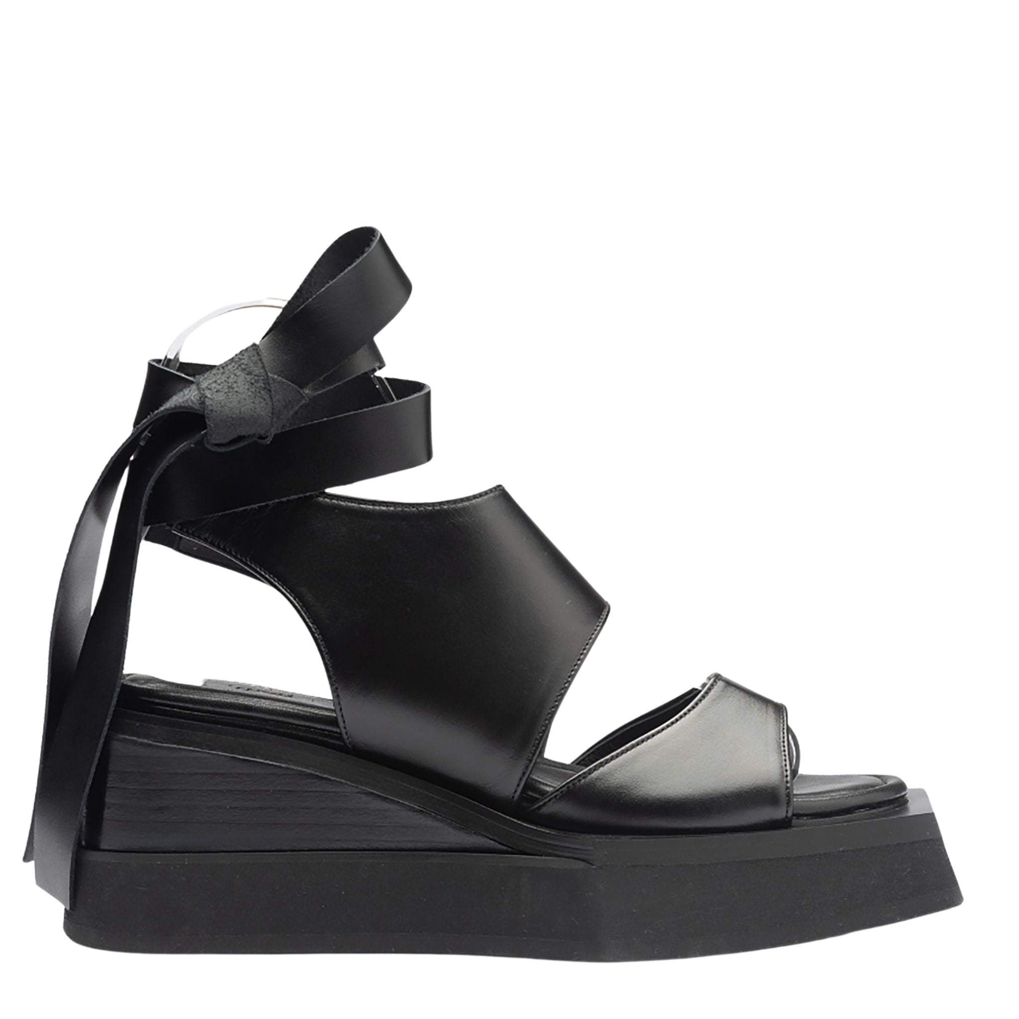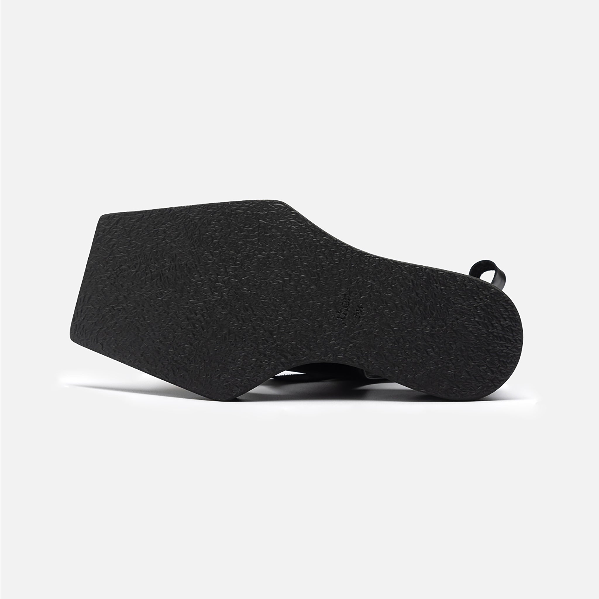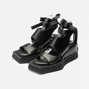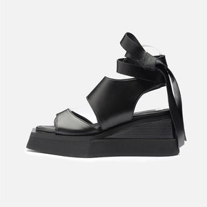 Architectural and striking, these black platform sandals by THEN elevate summer footwear with sculptural precision. Handcrafted in Korea in a limited studio run, they feature fluid leather panels and signature satin ribbon ankle ties that soften the bold, geometric silhouette. Set on an elevated wedge platform, they offer both height and all-day comfort - ideal for city days, gallery events, or summer evenings. Style with minimal tailoring or fluid dresses for a modern, romantic finish. A rare statement in independent craftsmanship.