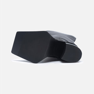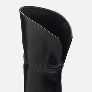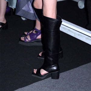 Architectural and bold, these black open-toe knee-high boots by THEN redefine transitional dressing with sculptural precision. Handcrafted in Korea in a limited studio run, they feature a square toe, cut-out vamp, and a stable block heel that balances height with comfort. The elongated shaft creates a sleek silhouette, while the open toe adds a modern, directional twist. Wear them with oversized knits, tailored coats, or mini silhouettes for standout styling across seasons. A rare statement piece for the fashion-forward wardrobe.