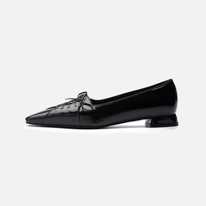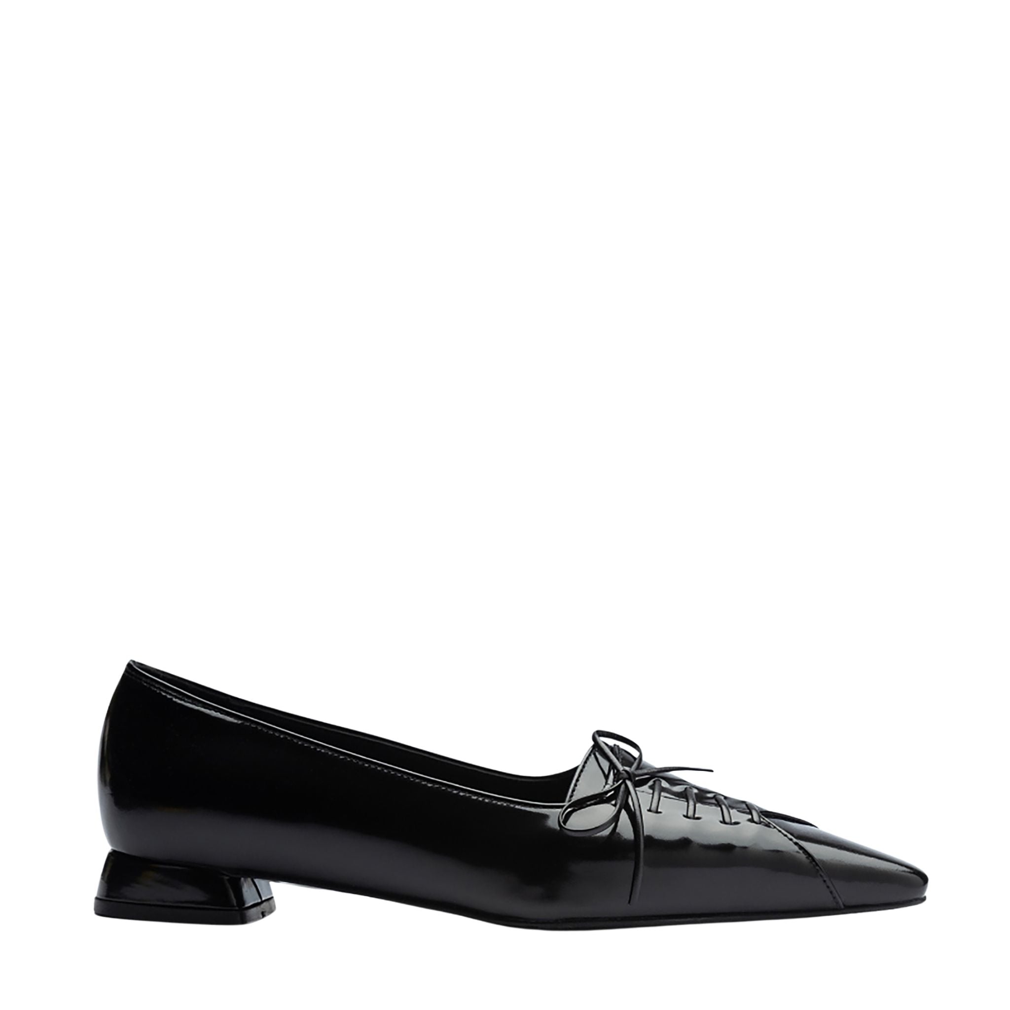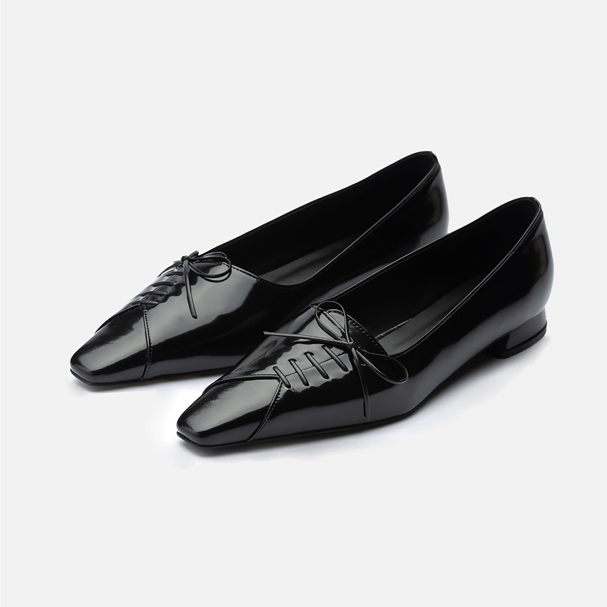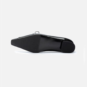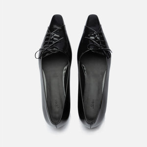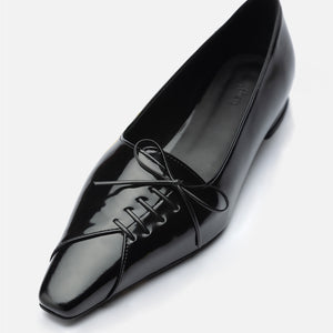 Crafted for the modern minimalist, these black patent lace-up flats by THEN reimagine the classic oxford with a feminine edge. A sharply pointed toe, glossy finish, and delicate front lacing lend quiet sophistication and architectural precision. Handmade in Korea in a limited studio run, they feature a sculpted low heel for subtle lift and all-day comfort - perfect for city walks, gallery visits, or polished workwear. Style with tailored trousers or offset airy dresses with their sleek, structured silhouette.