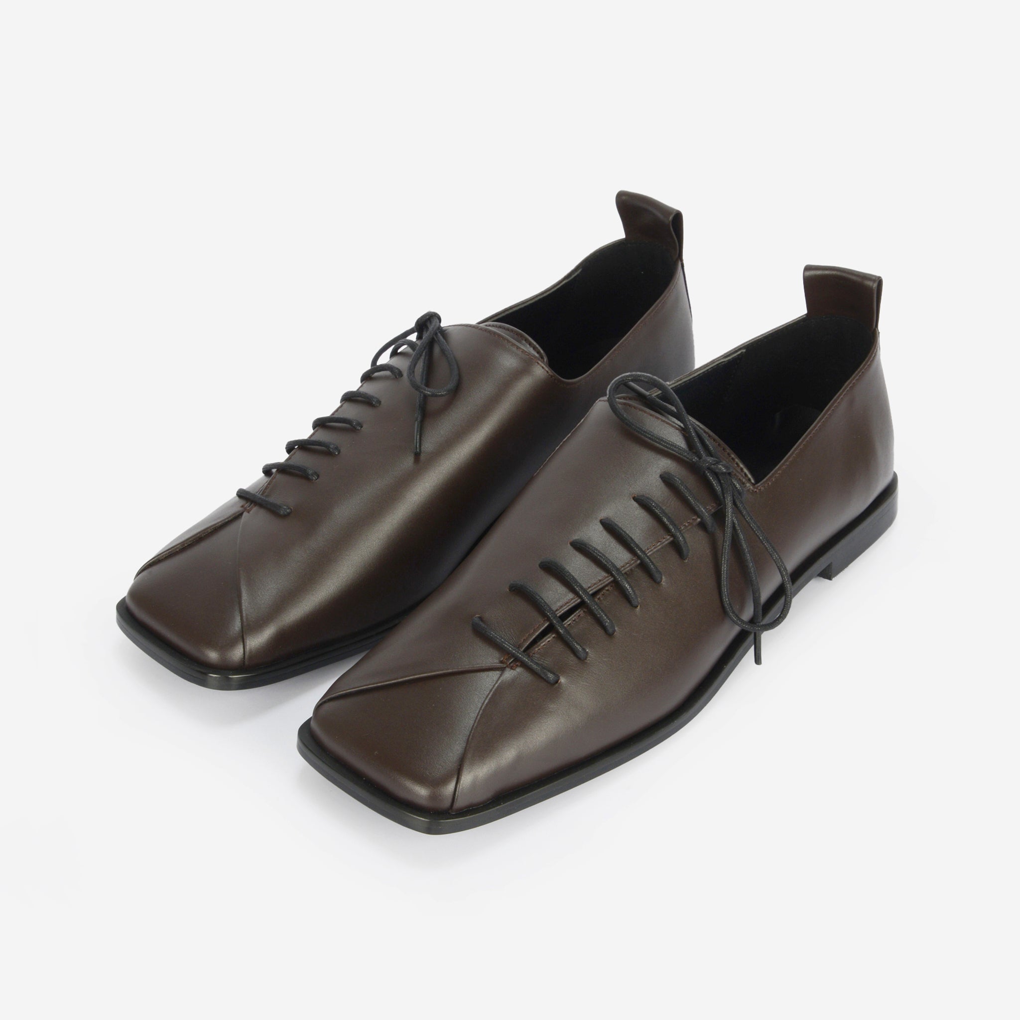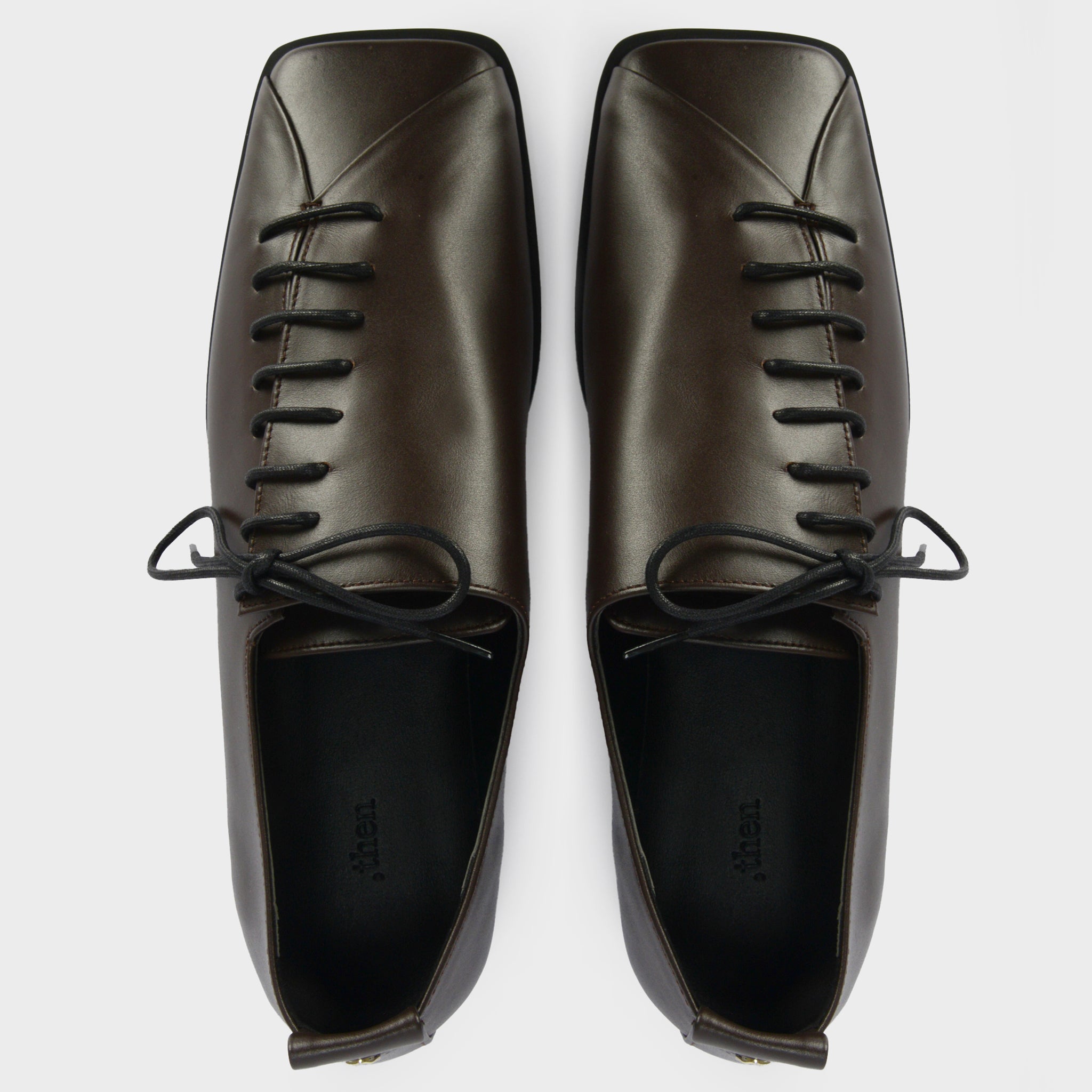 Modern minimalism, redefined. These brown square-toe lace-up flats by THEN feature a sculptural silhouette with elongated lines, matte leather finish, and a distinctive lace-up closure - blending menswear edge with feminine precision. Handcrafted in Korea in a limited studio run. Lightweight yet structured, they move effortlessly from weekday tailoring to weekend denim. The architectural toe and low-profile heel deliver all-day comfort with understated sophistication.