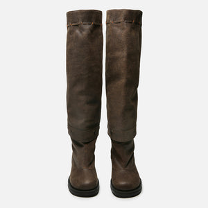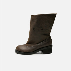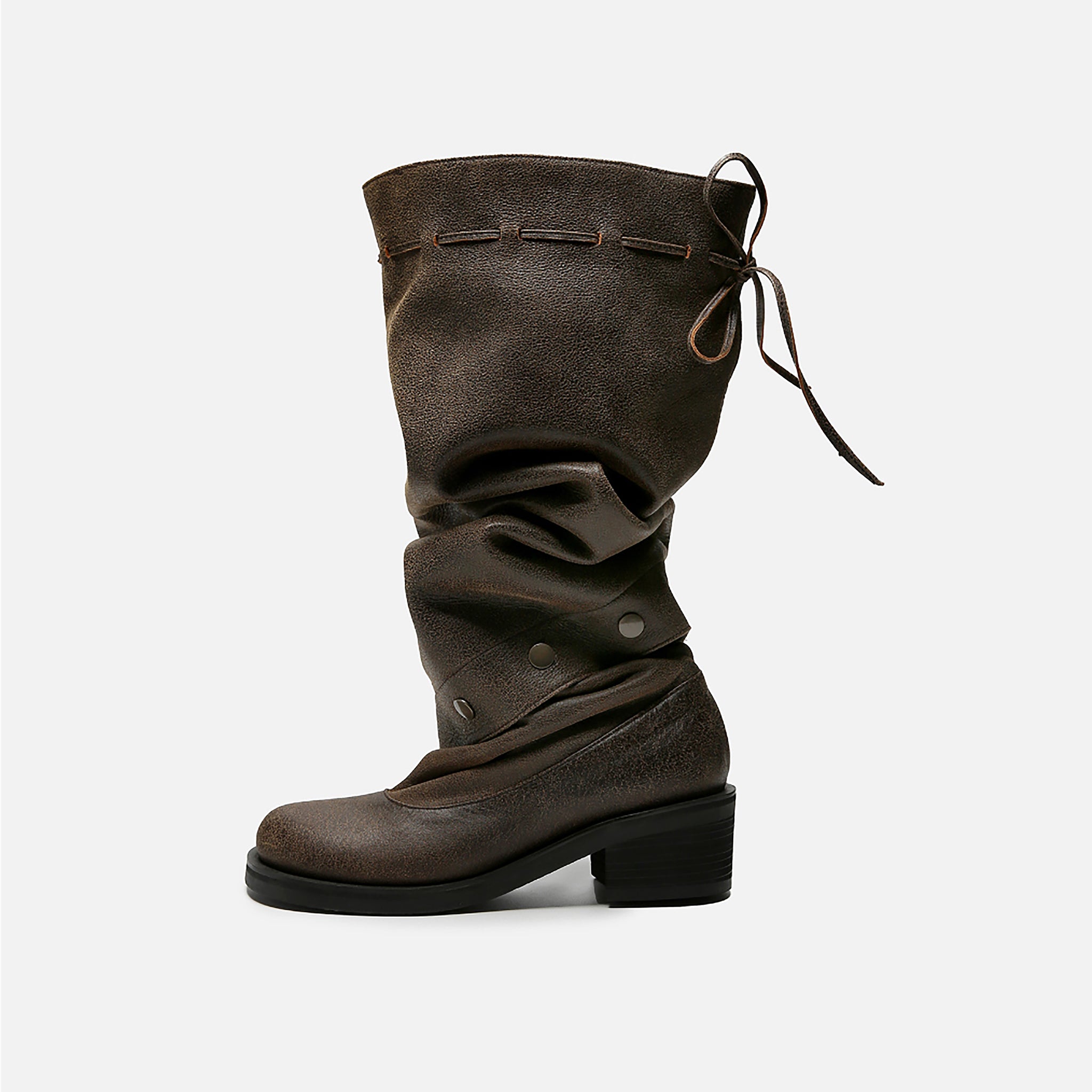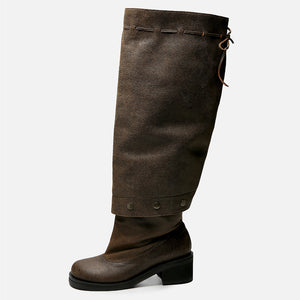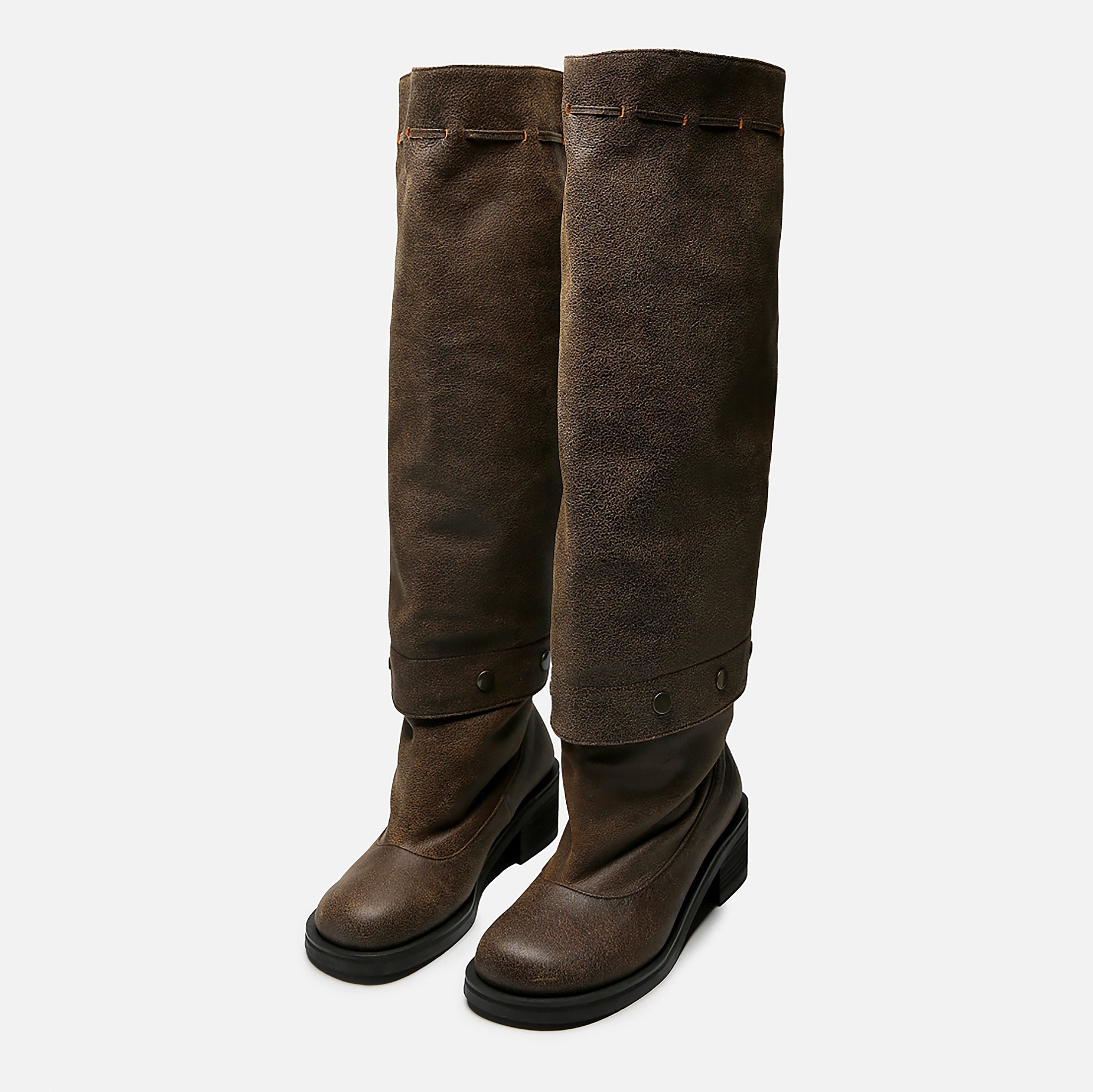Crafted for the bold dresser, the Convertible Multi-Wear Boots by THEN offer three silhouettes in one. Made in Korea in a limited studio run, this brown leather design features a richly textured finish and a slouchable upper shaft that can be worn tall, folded, or removed for a mid-calf look. Snap-button details and lace-through edging add structure to the deconstructed silhouette, while a low block heel ensures daylong comfort. Ideal for fall, winter, and transitional weather, this is a rare, artful take on utilitarian style - versatile, sculptural, and handcrafted for those who dress with intention.