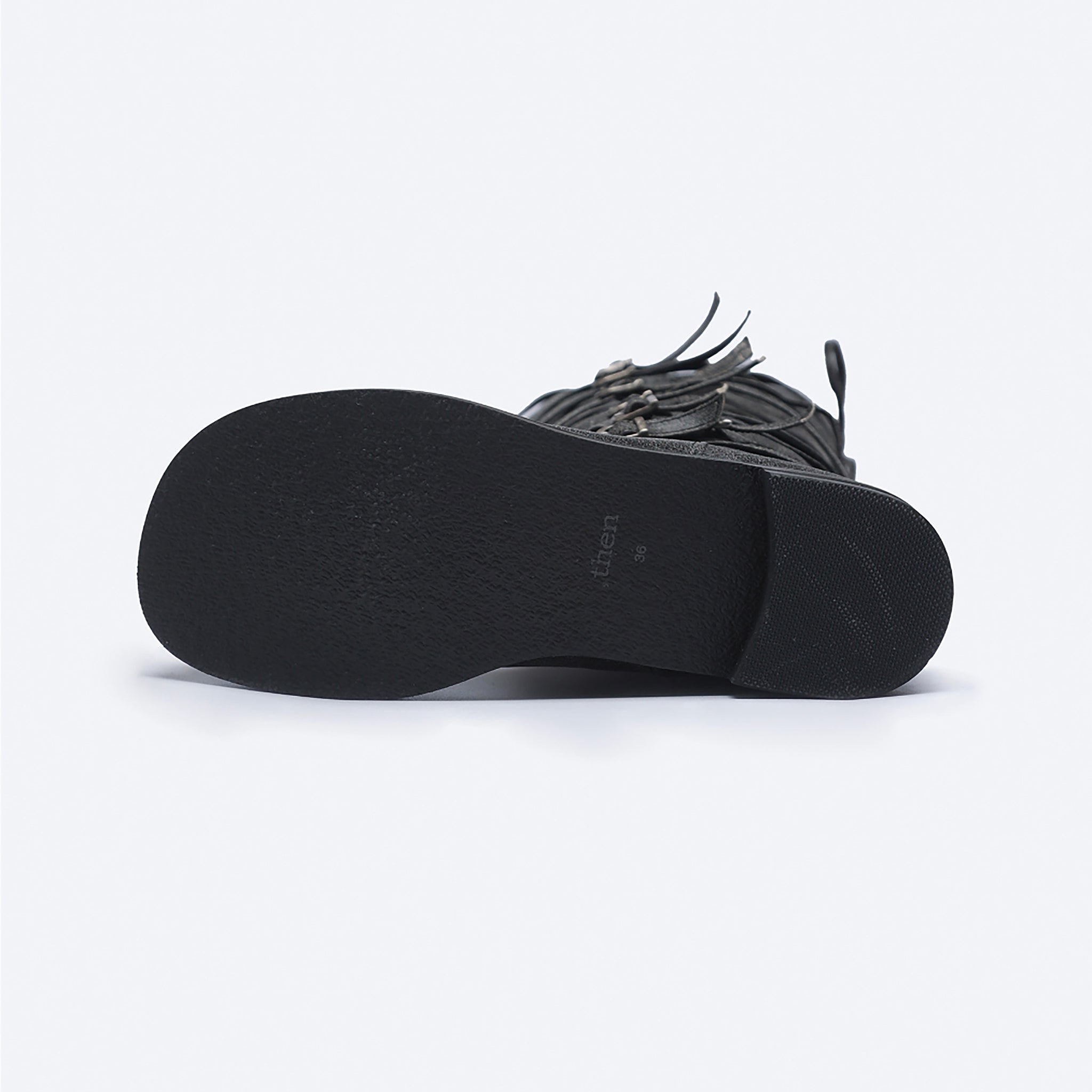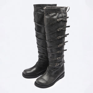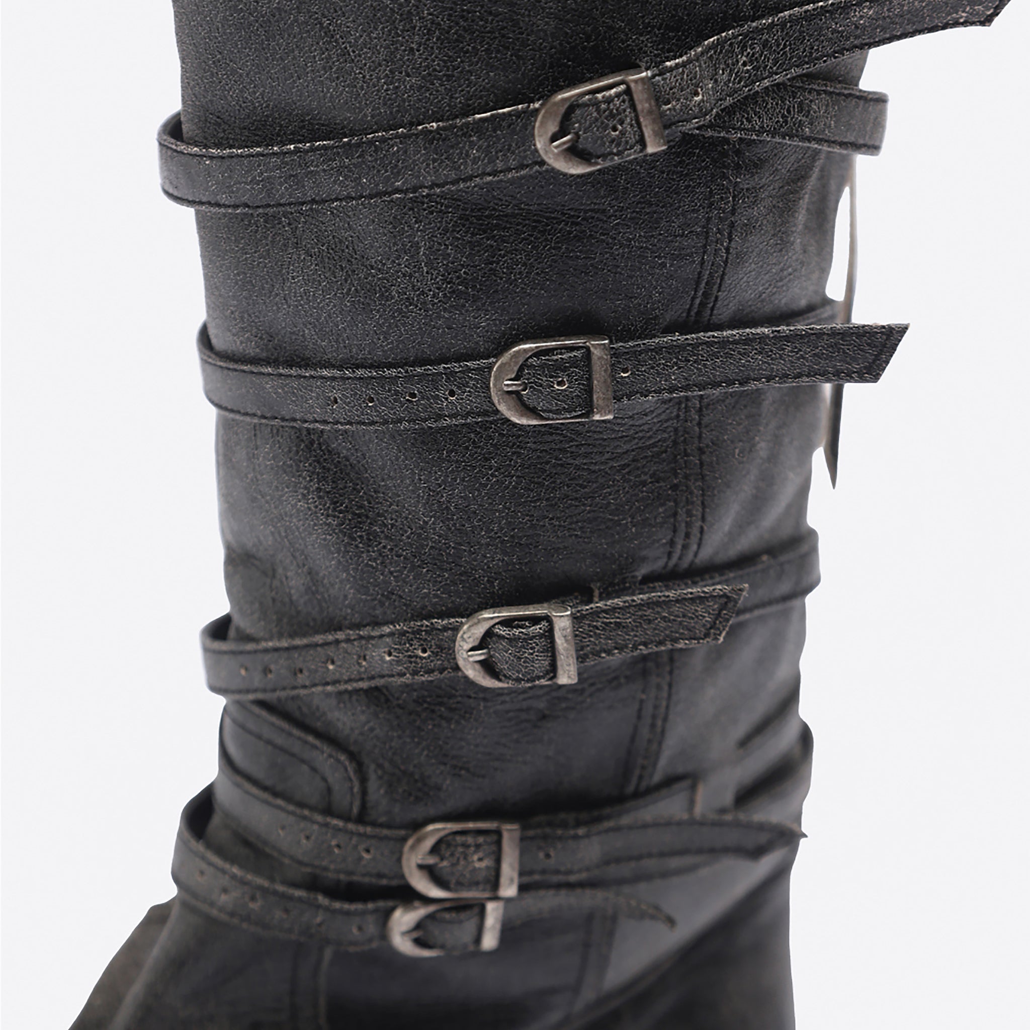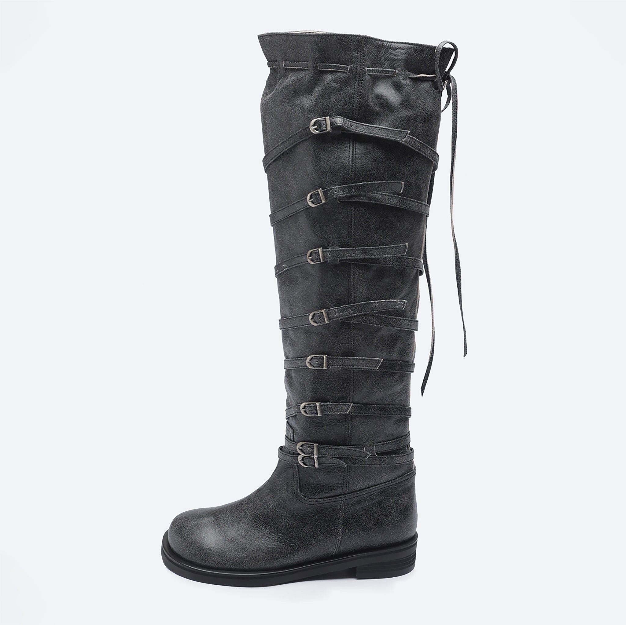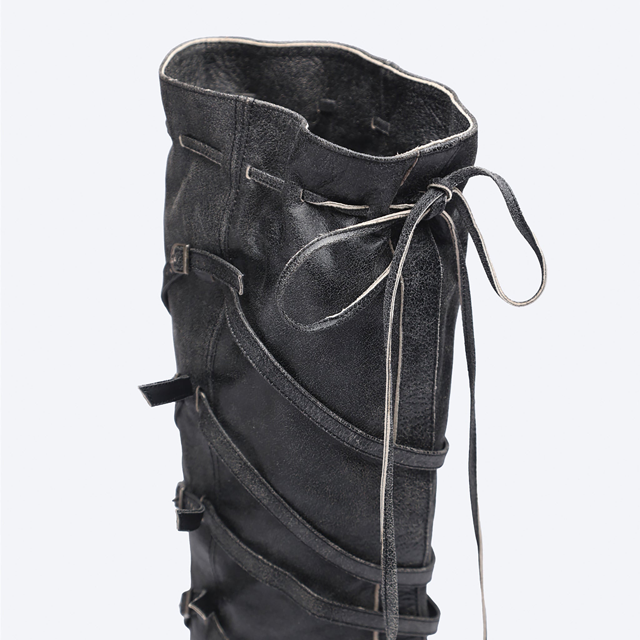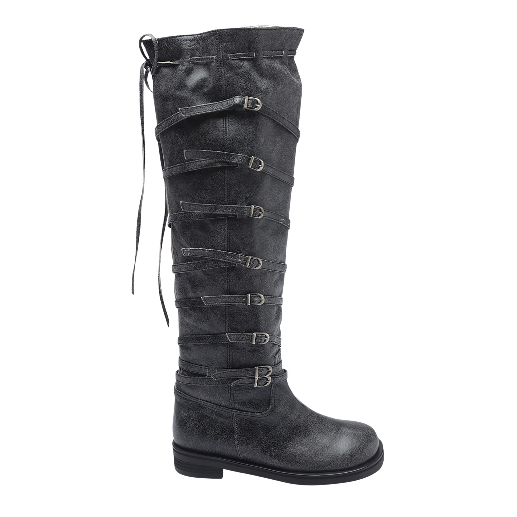 Material Note: The gray leather option is softer and more flexible than black and features a hand-finished vintage treatment. This finish includes intentional crackling and surface variation, which adds to its character and should not be considered a flaw. If you prefer a smoother finish, we recommend the matte black version. Fit & Sizing: The adjustable strap allows for a personalized fit around the calf. We recommend ordering your standard size. – For average foot widths: choose your regular size – For wider or fuller feet: consider ordering a half size up.