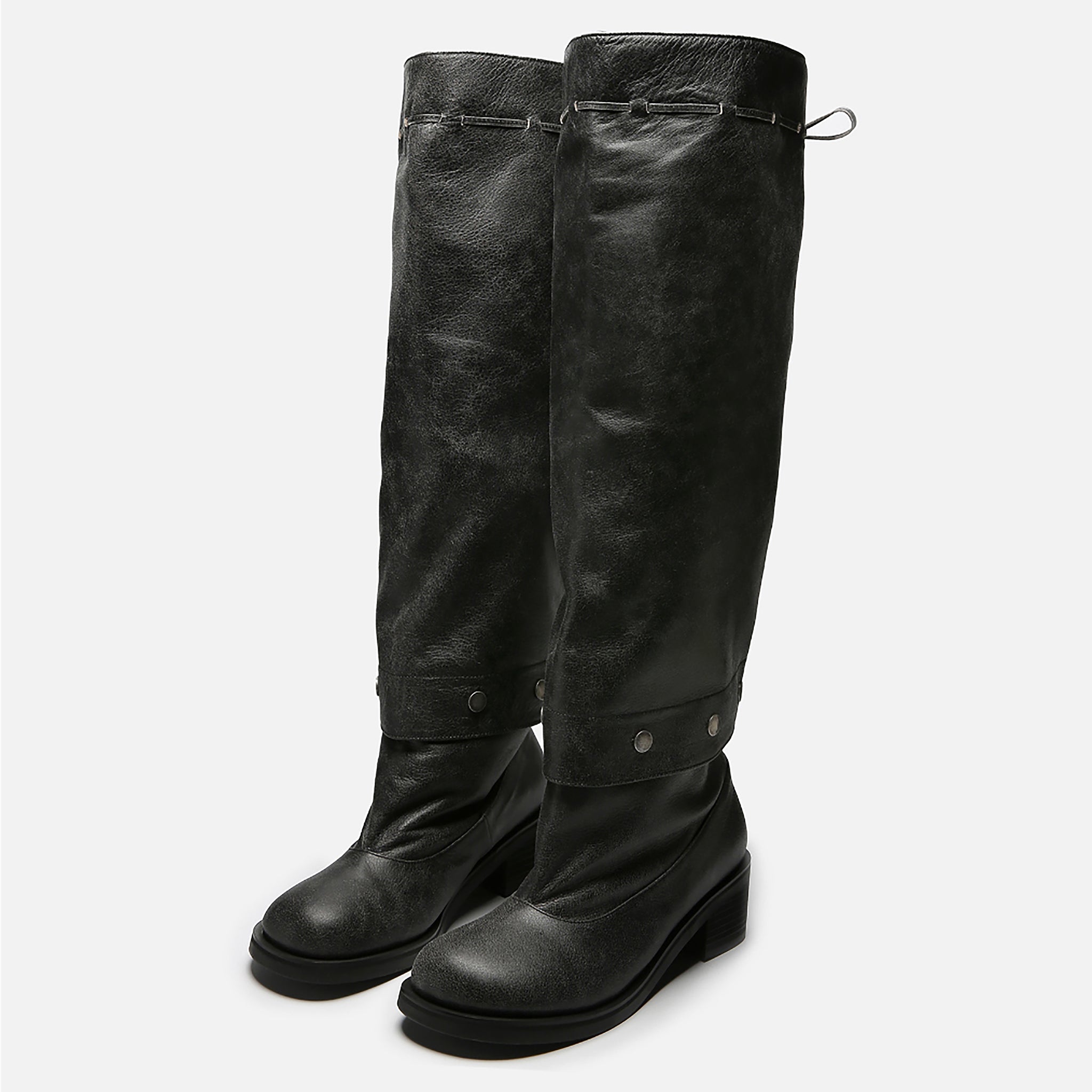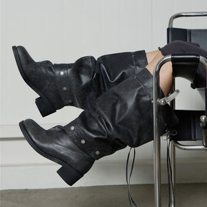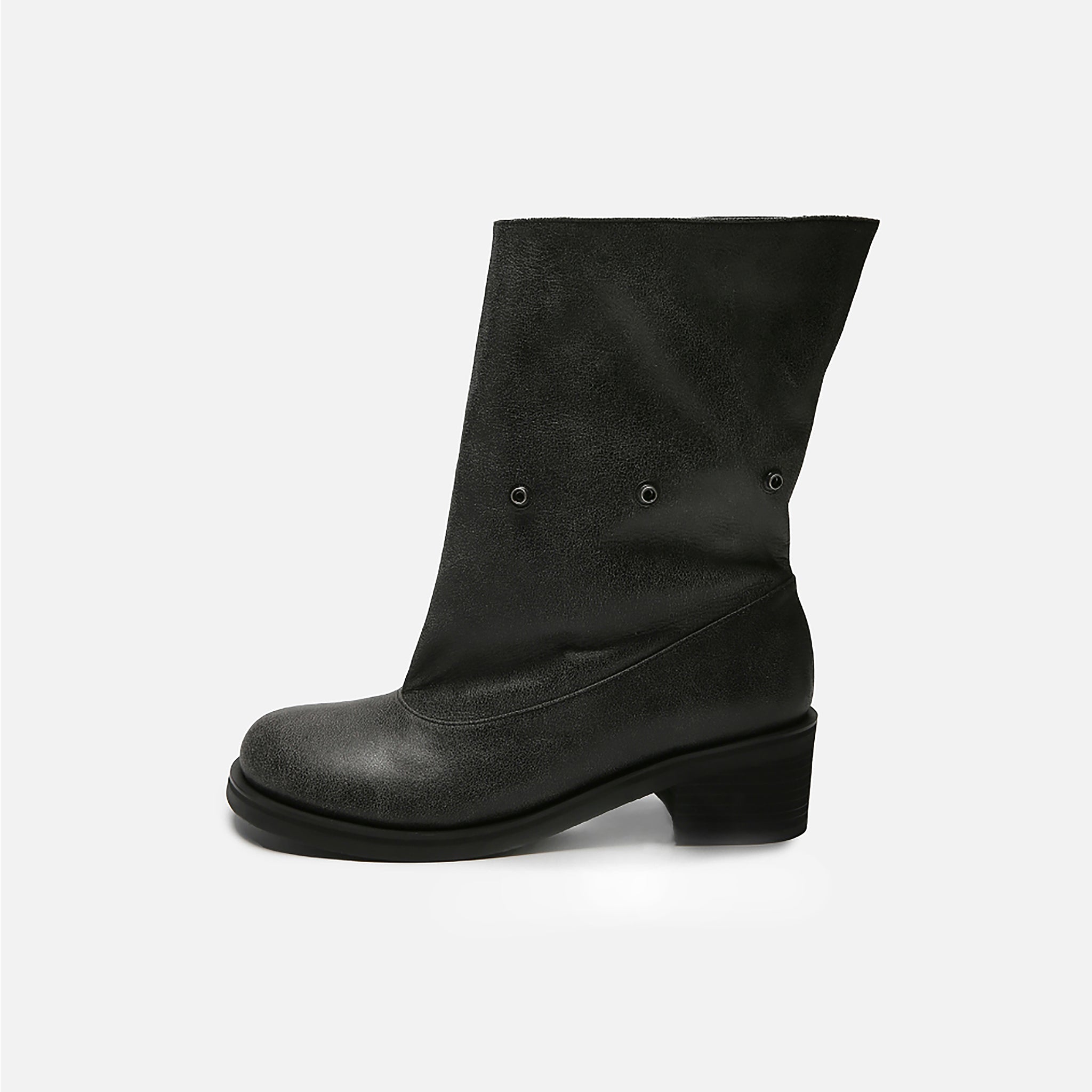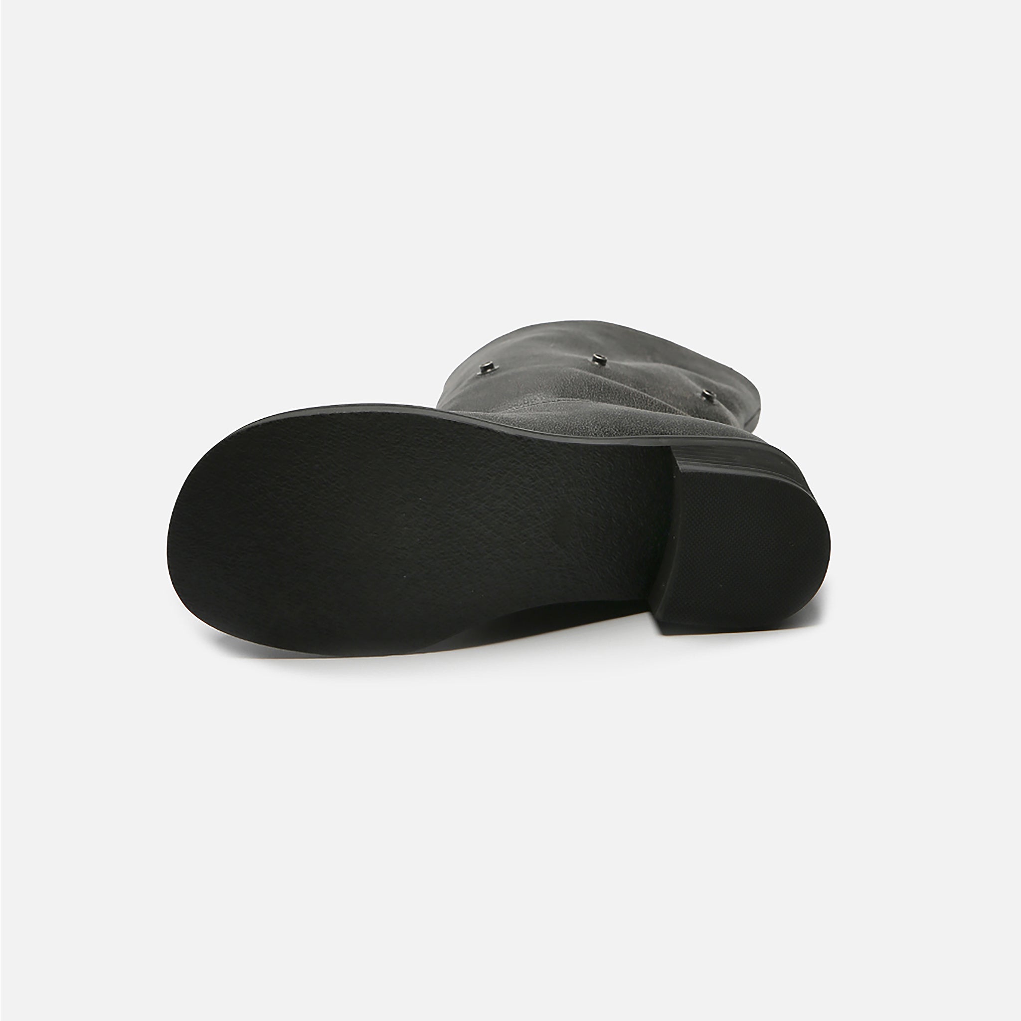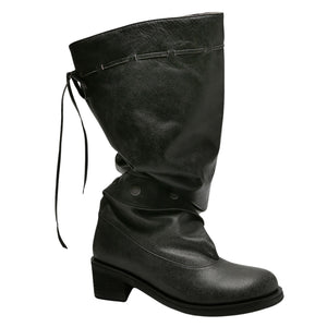 A study in modular design, these black convertible boots by THEN fuse sculptural form with everyday function. Handcrafted in Korea in a limited studio run, they feature a rounded toe, stacked heel, and a soft, slouchable upper that can be worn tall or folded, secured by minimalist metal snap buttons. The natural texture of the leather allows fluid movement between silhouettes - wear tall over slim trousers or folded with knits and dresses. Designed for year-round wear, this piece reflects THEN’s signature blend of quiet innovation and artisanal craftsmanship.