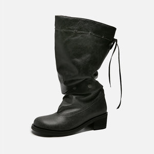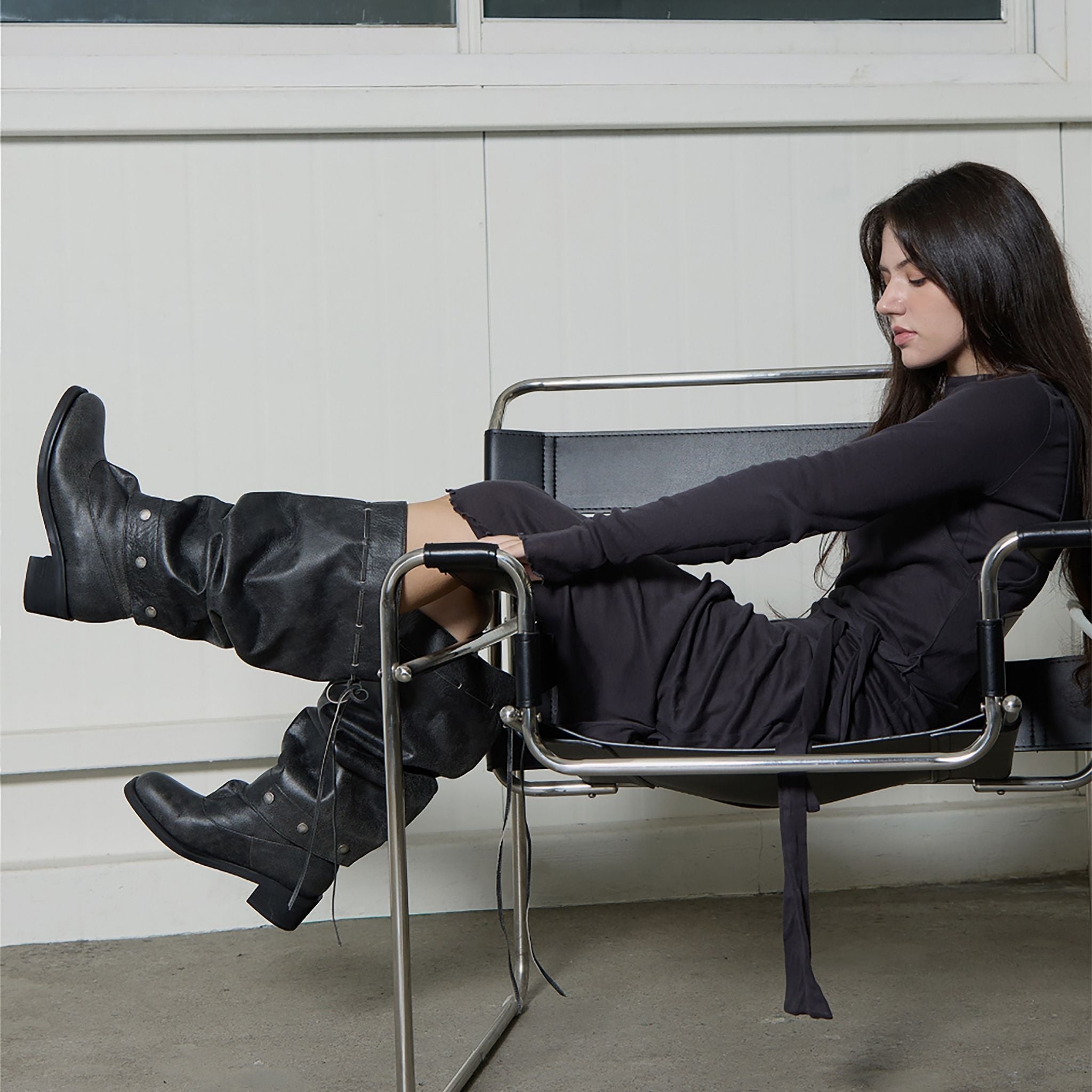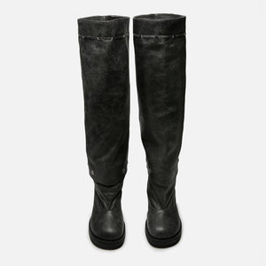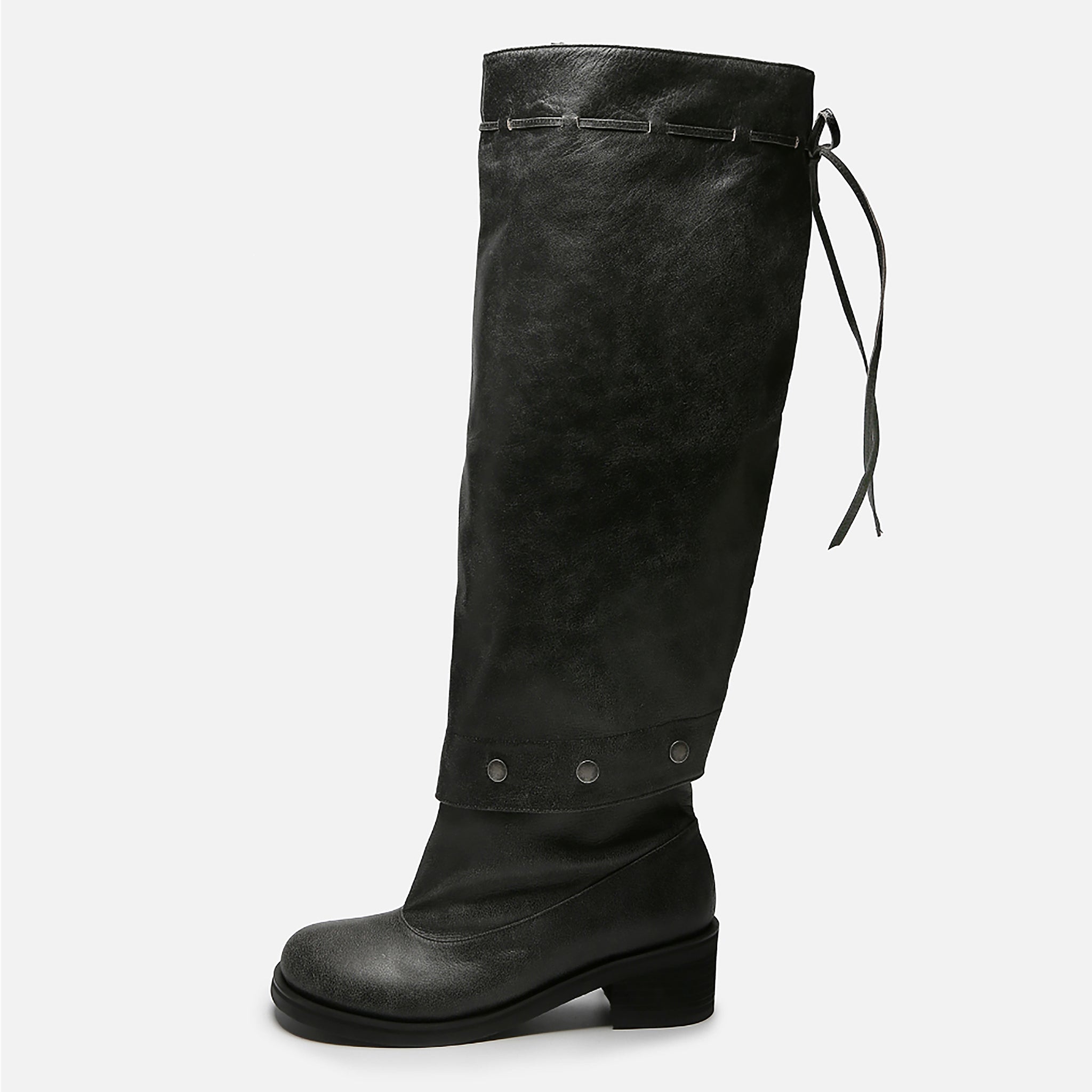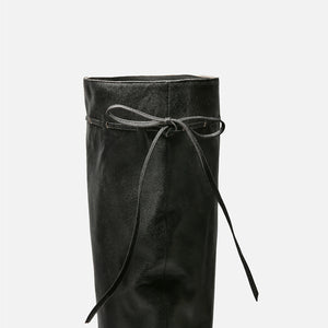 A study in modular design, these black convertible boots by THEN fuse sculptural form with everyday function. Handcrafted in Korea in a limited studio run, they feature a rounded toe, stacked heel, and a soft, slouchable upper that can be worn tall or folded, secured by minimalist metal snap buttons. The natural texture of the leather allows fluid movement between silhouettes - wear tall over slim trousers or folded with knits and dresses. Designed for year-round wear, this piece reflects THEN’s signature blend of quiet innovation and artisanal craftsmanship.
