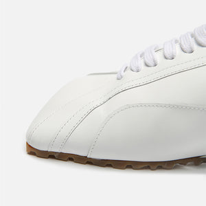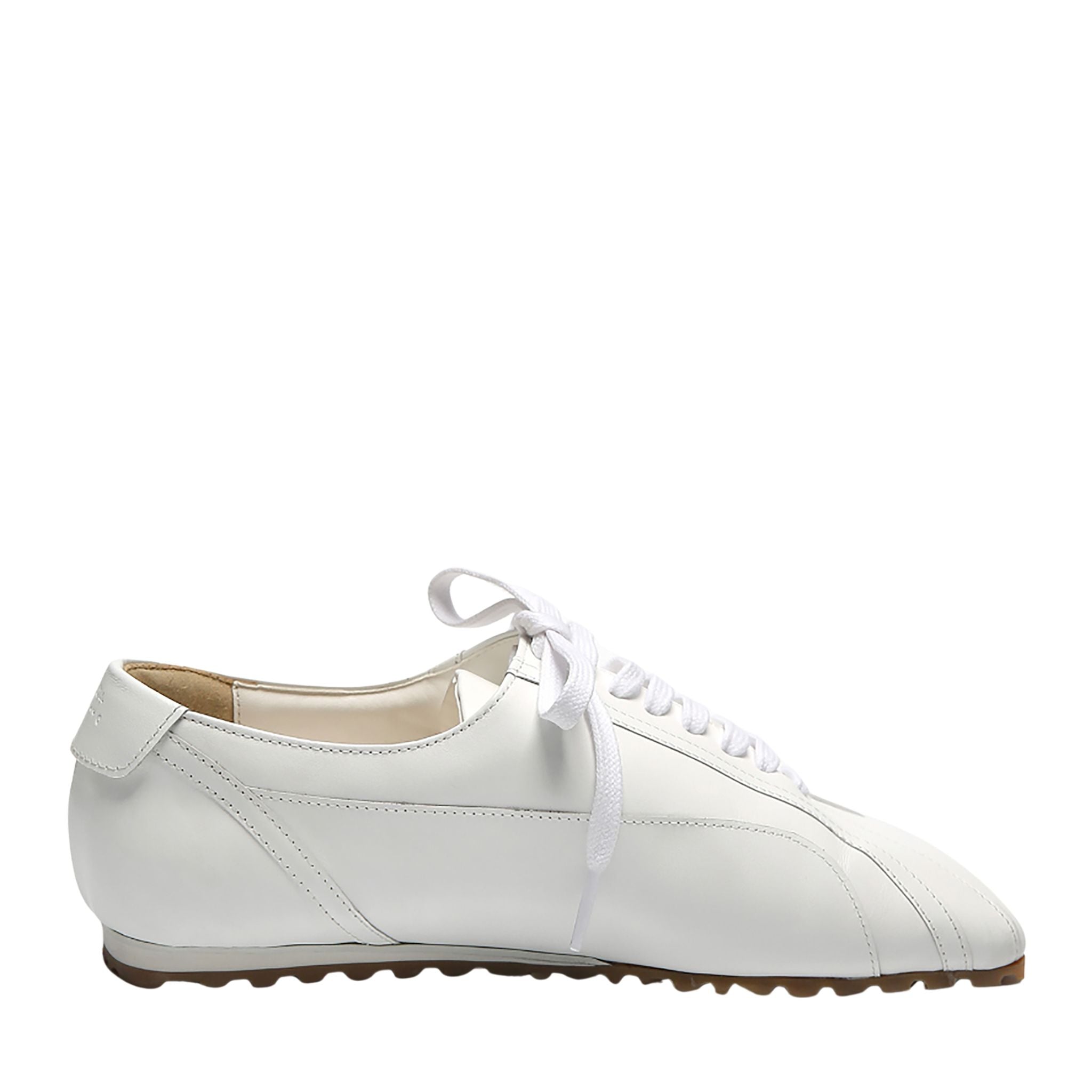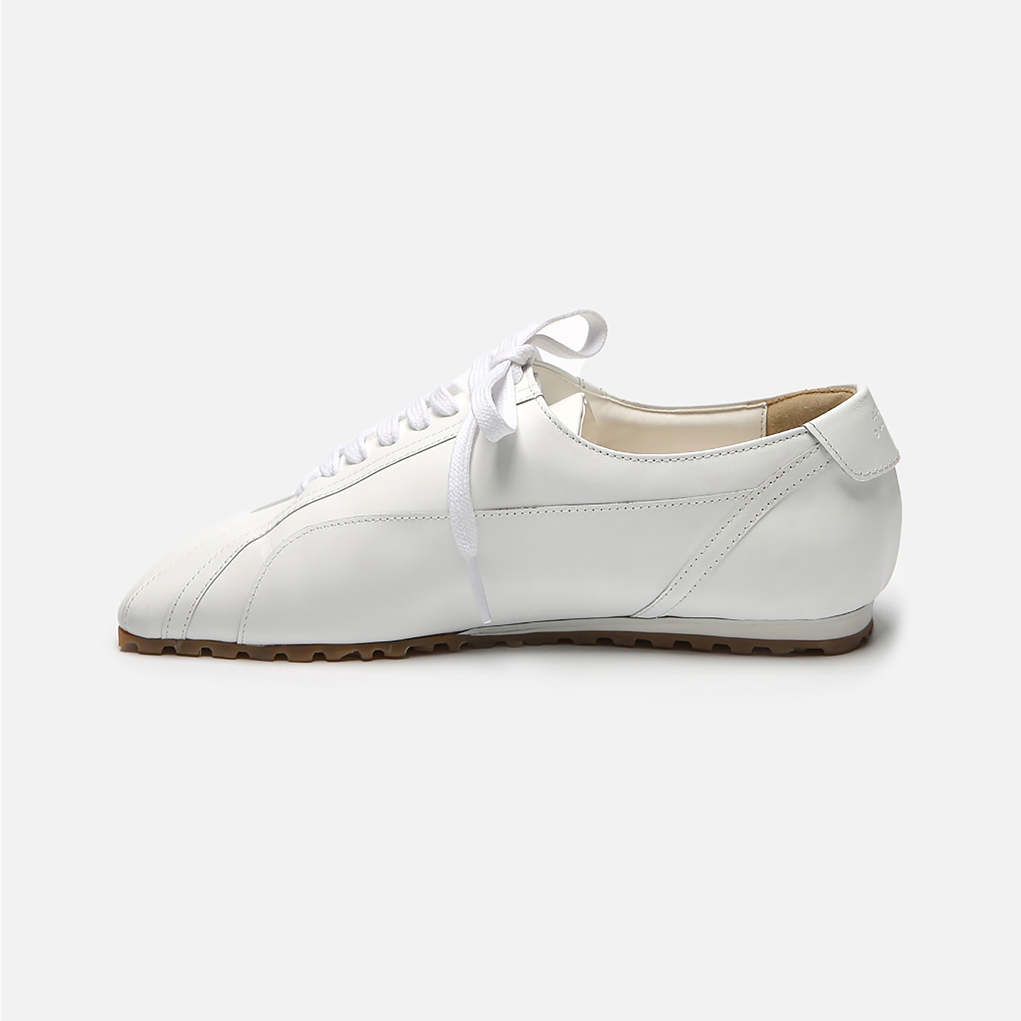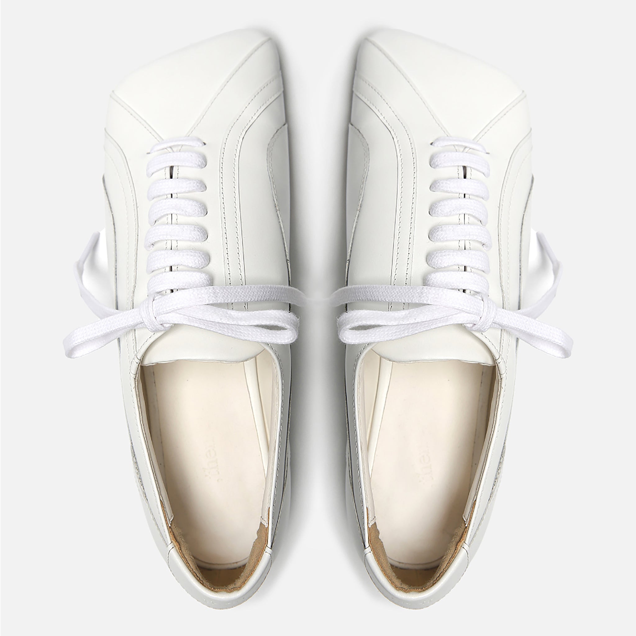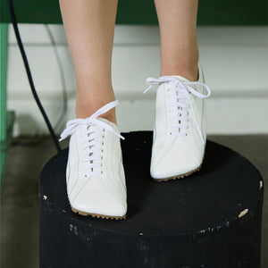 Clean, sculptural, and quietly luxurious - these white leather lace-up sneakers by THEN elevate everyday essentials with an architectural silhouette. Crafted in Korea in a limited studio run, they feature premium soft leather, subtle panel stitching, and the brand’s signature elongated toe. A lightweight rubber sole offers day-to-night comfort, while the all-white palette ensures easy pairing with tailoring, denim, or summer dresses. Understated, refined, and endlessly wearable - this is quiet luxury in motion.