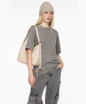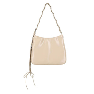 SELL WITH USThis medium shoulder bag in ballerina light beige artificial leather features a structured square silhouette with elegant lace-up detailing throughout. Designed with a hidden magnetic snap closure and an adjustable shoulder strap for customizable wear, it blends soft femininity with modern edge. The black cotton twill-lined interior includes a practical patch pocket for daily essentials.