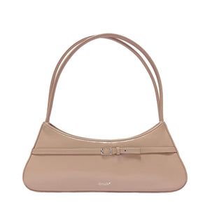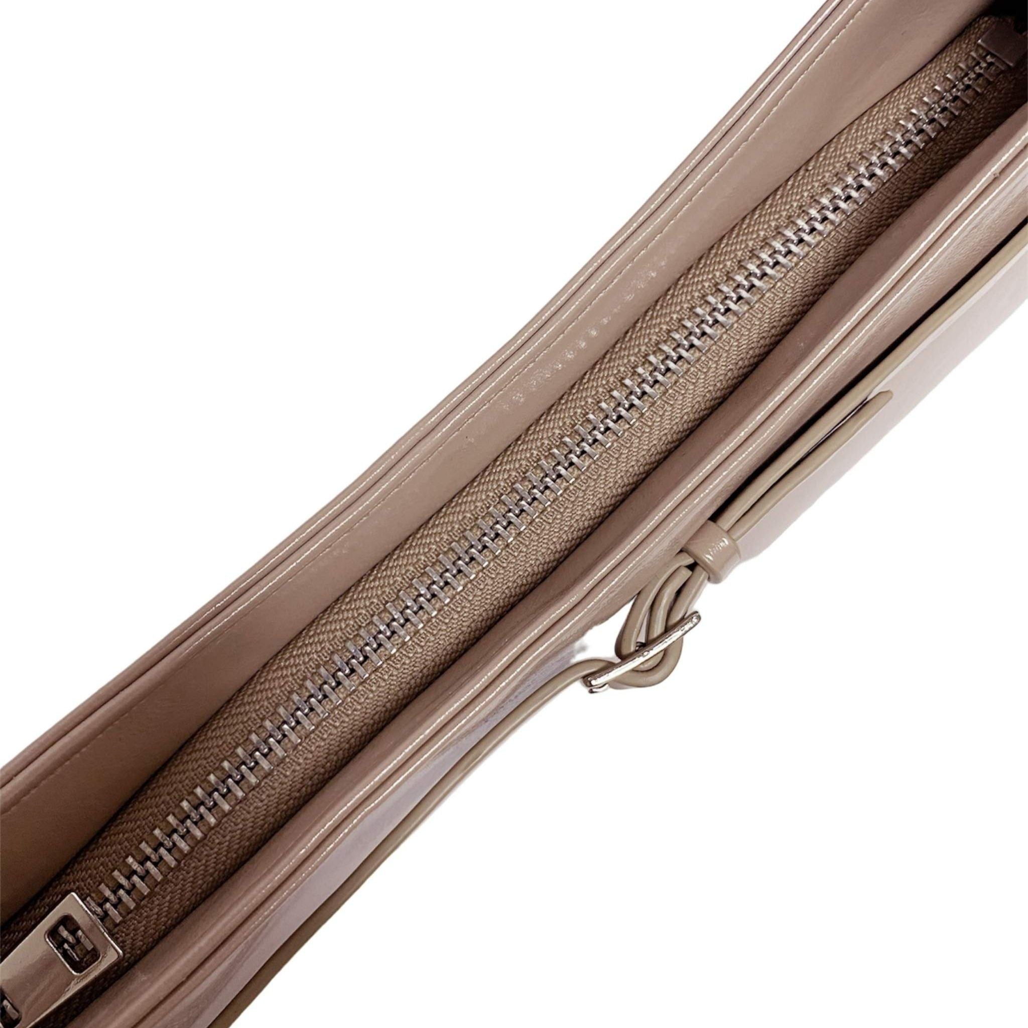 SELL WITH USThis small beige baguette bag in smooth vegan leather offers understated elegance with a modern twist. A mini pin-buckle strap detail at the front adds a refined edge, while the top zipper closure keeps your essentials secure. Designed with thin double shoulder straps for easy styling, the interior is lined with black cotton twill and features a built-in card slot for added convenience.
