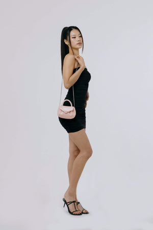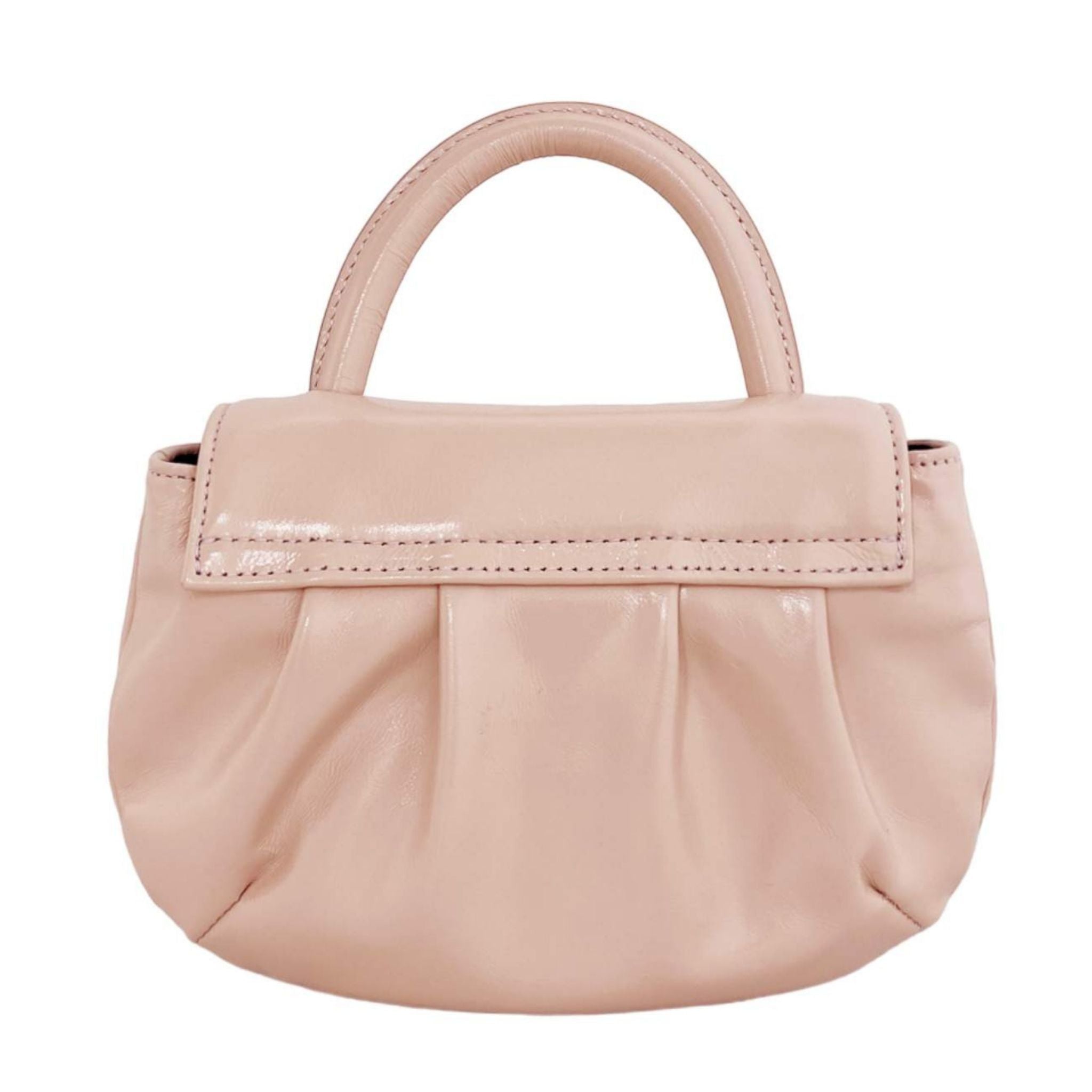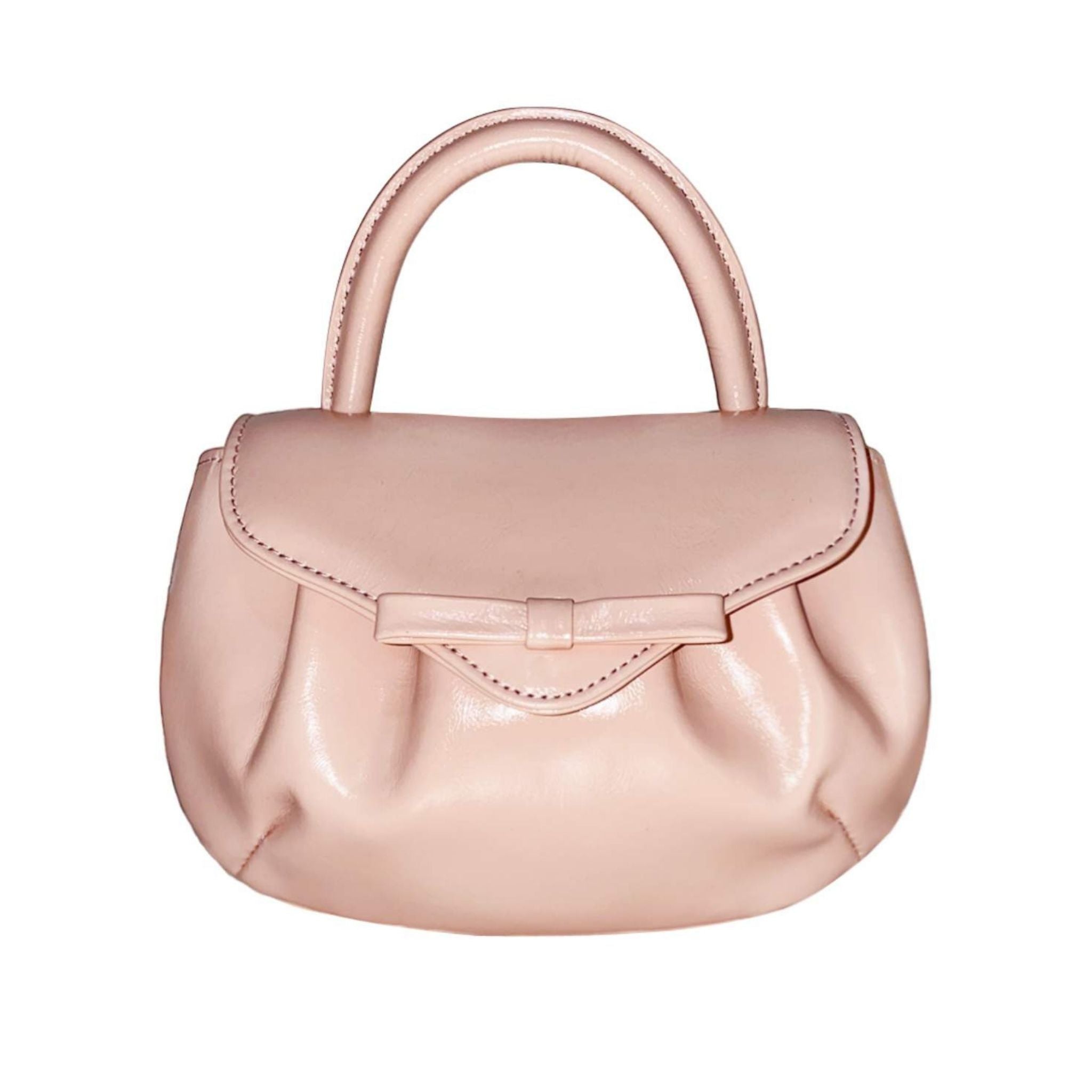 SELL WITH USChic and compact, this mini top handle evening bag is crafted in pink beige crinkled leather for a softly textured, romantic finish. A delicate bow accent adorns the foldover flap, secured with a hidden magnetic closure. Carry it by the top handle or wear it crossbody with the detachable chain strap. The black cotton twill-lined interior features a convenient card slot for your essentials.