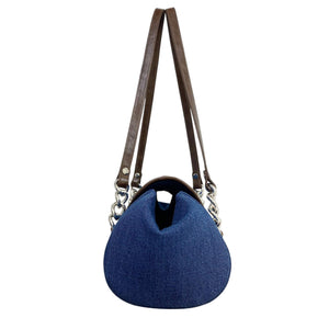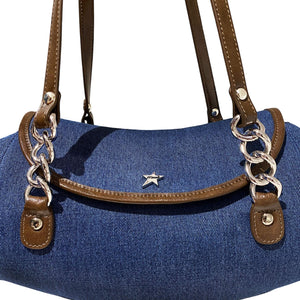 SELL WITH USThis 2000s-inspired curved cylinder shoulder bag combines classic blue denim with rich brown vegan leather for a bold, nostalgic look. Accented with TTMAB logo-engraved hardware at the front and finished with a sleek chain shoulder strap, it brings Y2K flair to modern styling. The magnetic closure reveals a black cotton twill-lined interior with a secure zip pocket for your essentials.