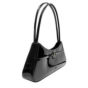 SELL WITH USAdd a sleek statement to your look with this small black patent leather baguette bag. The glossy finish is paired with a mini pin-buckle strap detail at the front for a touch of modern edge. Featuring a secure top zipper closure and thin double shoulder straps, the interior is lined with black cotton twill and includes a practical card slot—perfect for day-to-night wear.