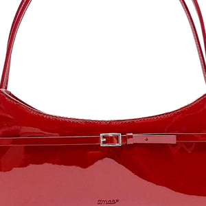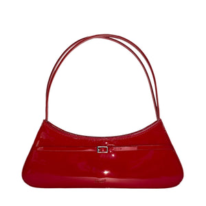 SELL WITH USTurn up the heat with this small red patent leather baguette bag, designed to make a bold impression. Its high-gloss finish is complemented by a sleek mini pin-buckle strap detail on the front. With a secure top zipper closure and slim double shoulder straps, this bag balances style and function. Inside, black cotton twill lining and a built-in card slot keep your essentials organized.