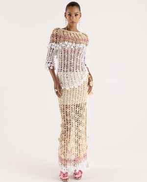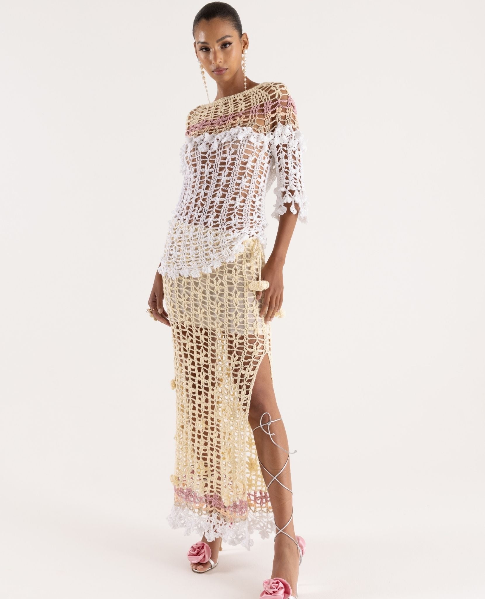 Vanilla handmade crochet skirt is a loose open-knit with lining, a fitted silhouette creates perfect fit. Perfect combination with Multicolor Vanilla crochet top and pair of mules.