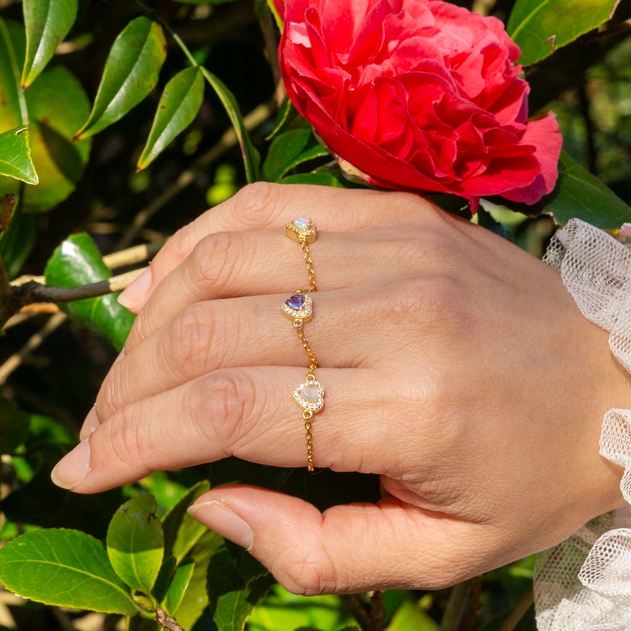 A symbol of luxury and ambition, the purple ring brings a regal touch to any look. Crafted from 18-carat gold-plated silver, the adjustable zipper design fits all finger sizes. It reflects the opening of hidden moods and the quiet shift within. Let the color speak to your heart—worn boldly on your fingers.
