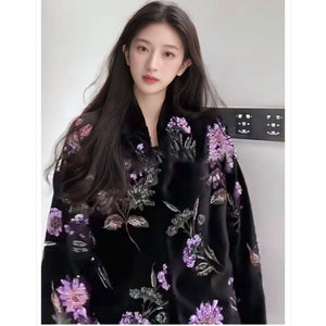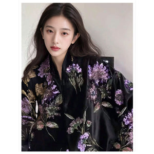 SELL WITH USAn ethereal statement of modern romance, this WJY embroidered jacket is crafted from deep black fabric and intricately adorned with violet floral motifs that symbolise elegance and renewal. An asymmetric front closure with a side-tie detail offers a subtle nod to traditional silhouettes, while soft feather-trimmed cuffs add movement and a dreamlike finish.